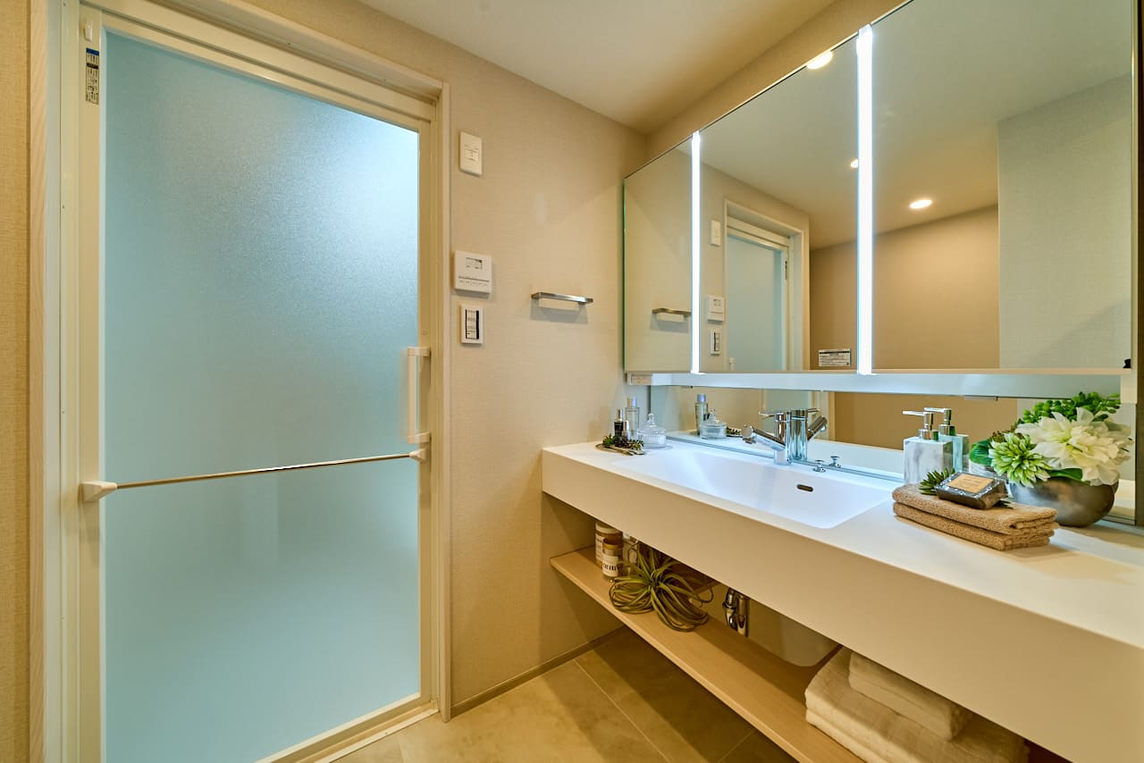 ゆとりのあるカウンターで身支度がしやすい洗面化粧台です。三面鏡の中には化粧品などが収納できて使い勝手良好。照明が縦に配置されているので、顔に影をつくらないのも嬉しいですね。