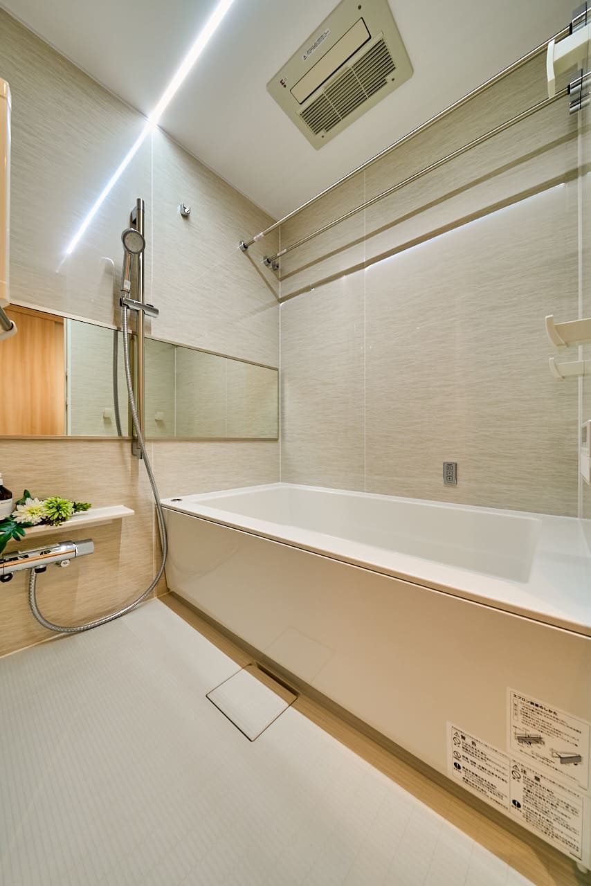 ベージュトーンで落ち着いた雰囲気のバスルームです。お風呂にゆっくり浸かるのが好きという方に嬉しい追い焚き機能を搭載。家族の入浴時間がずれてしまっても安心です。また、浴室乾燥機付きのため雨の日の洗濯物にも困りません。