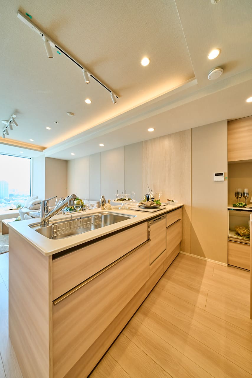 キッチンは、動線が最小限に済んで料理が捗るⅡ型。リビングダイニングを見渡しながら料理ができる対面式にもなっているので、家族や来客との会話も弾みます。