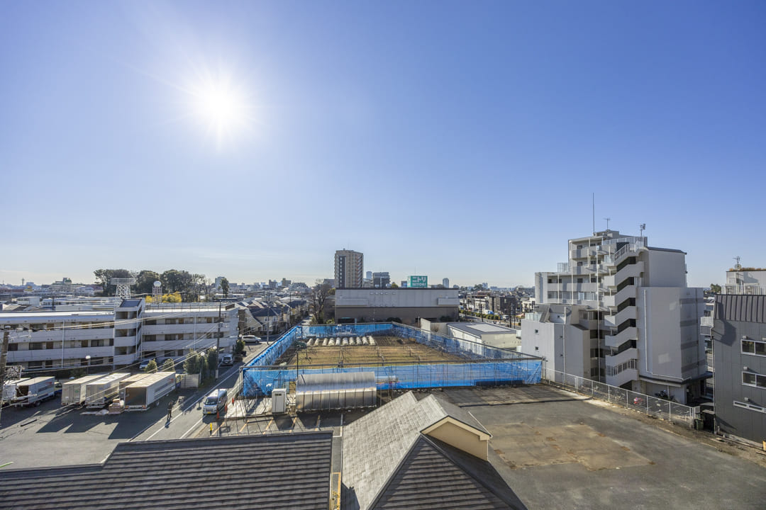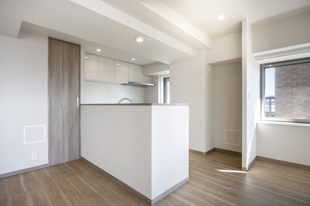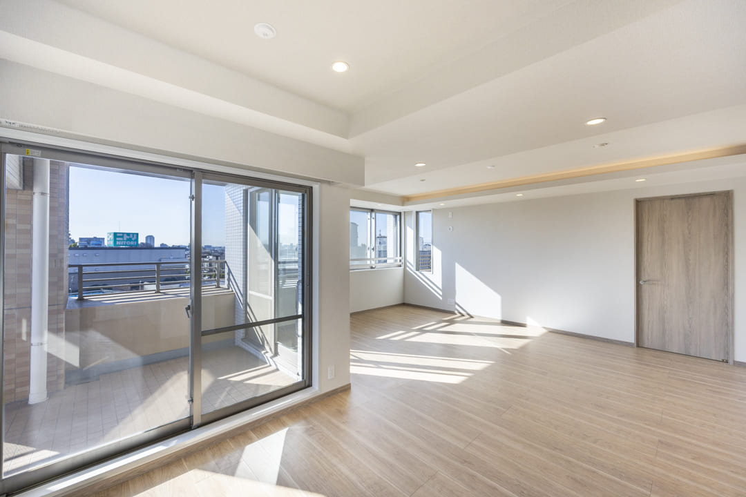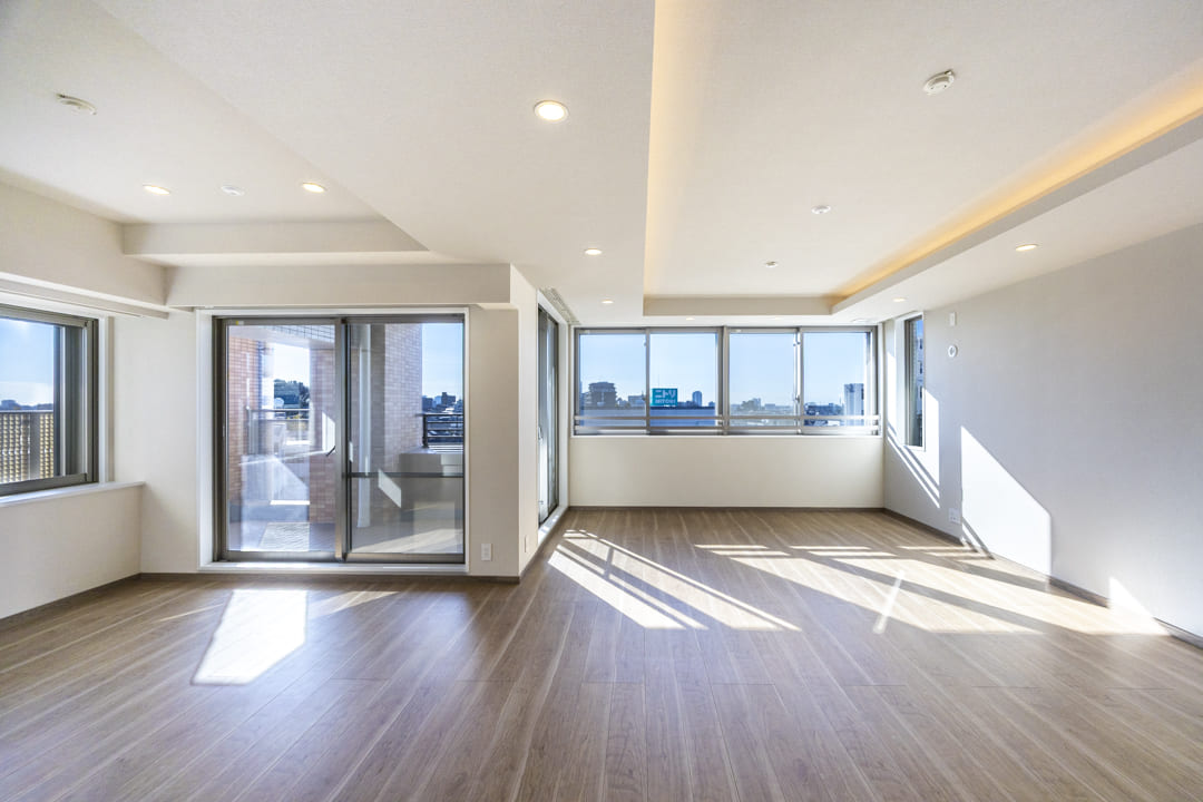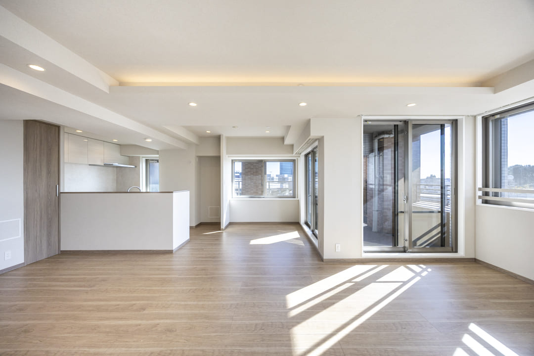 約27.0帖の広々としたリビングダイニングキッチンです。二面採光で南向きのため日当たり・通風が良好。窓からは世田谷の落ち着いた住宅街が広がっています。また、天井には間接照明があしらわれていて、お部屋に上品さをプラスしてくれています。