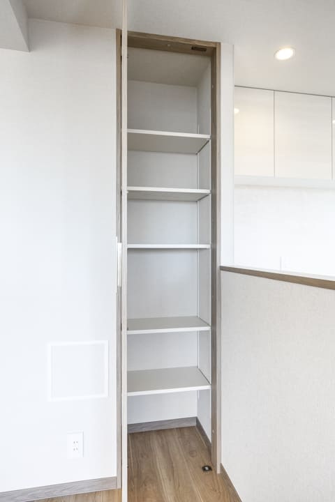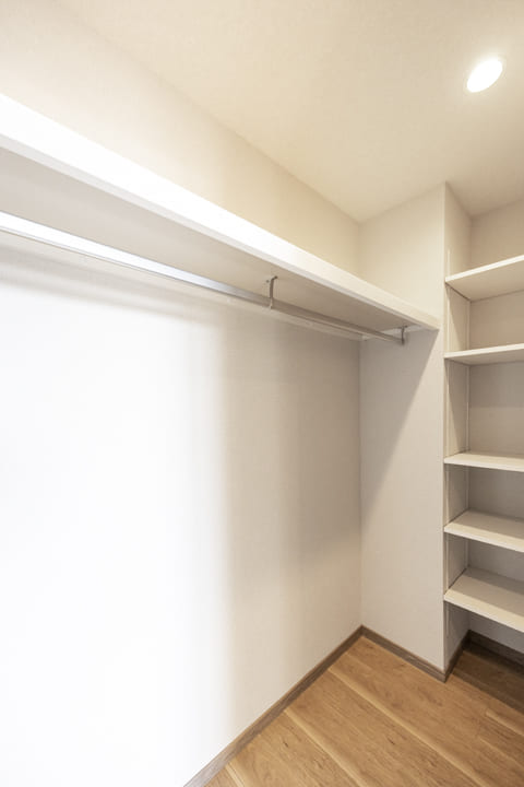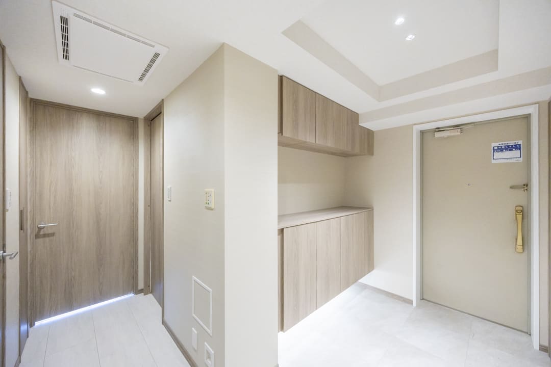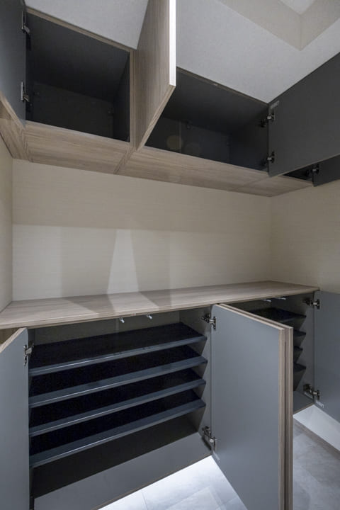 玄関入って右側にはシューズボックスが備え付けられています。セパレートタイプのため、靴を収納できるだけでなく、小物やアロマなどを飾ることもできますよ。フットライトの光が優しく足元を照らしてくれるのも◎。