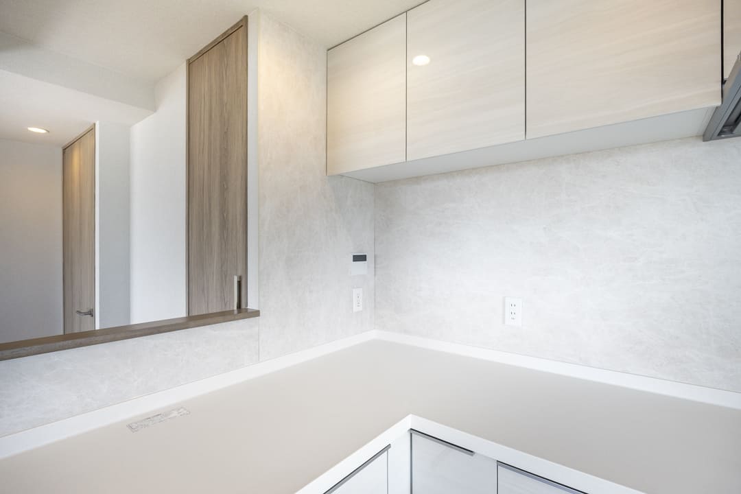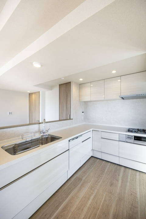 動線が最小限に済んで料理が捗るL型のキッチンです。作業スペースや収納スペースも広めに確保できて便利です。また、対面式にもなっているので、家族や来客とのコミュニケーションが取りやすくて◎。
