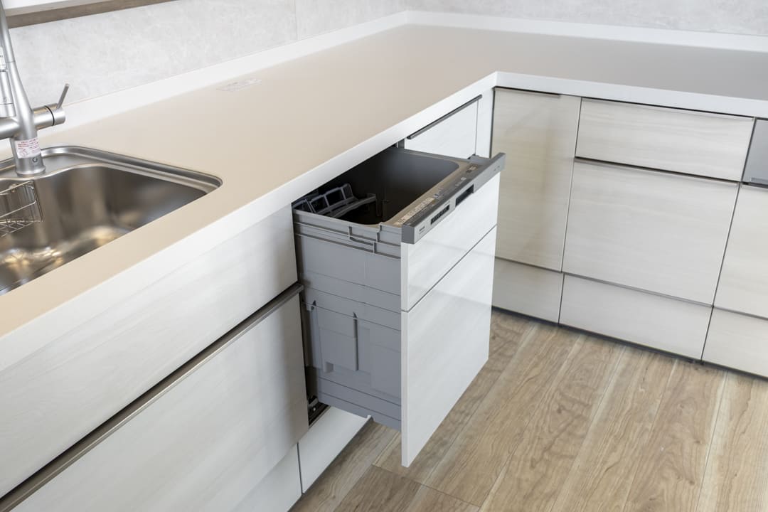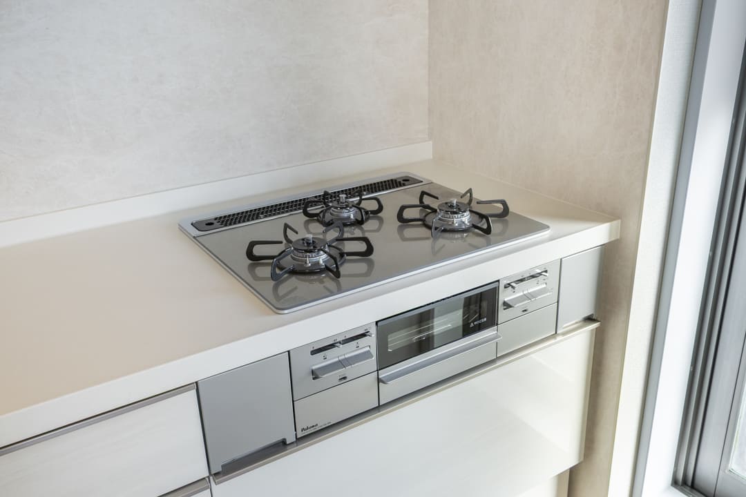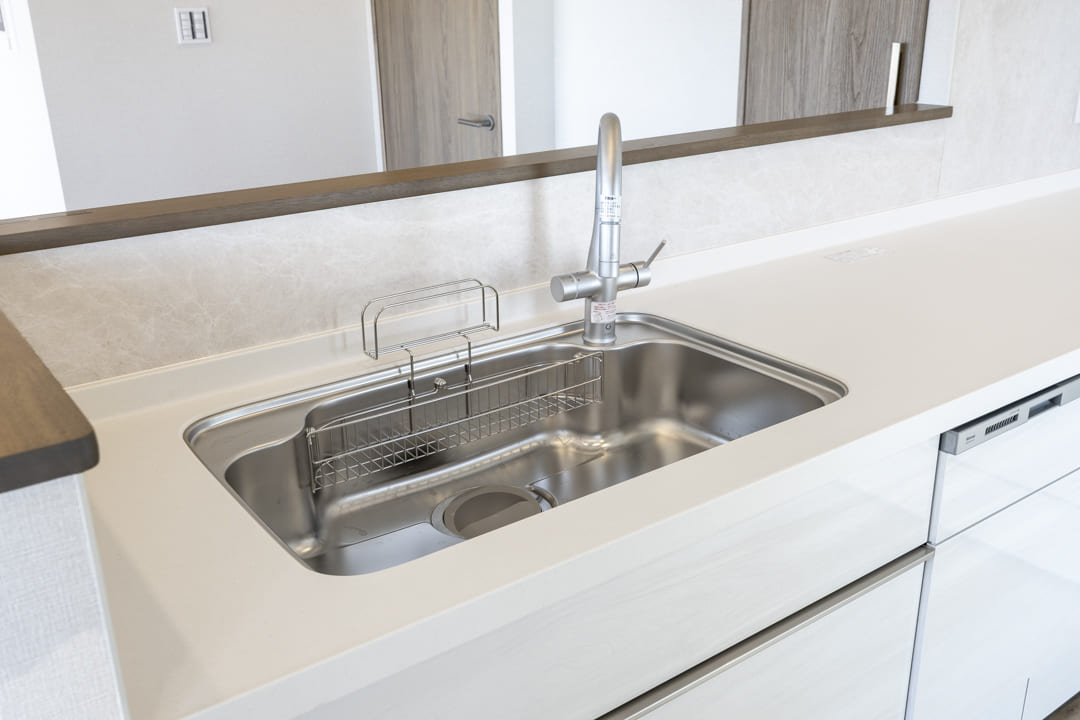 3口コンロ、グリル、食洗機付きと設備面も充実しています。シンクも広々としているので野菜などが洗いやすそうですよ。