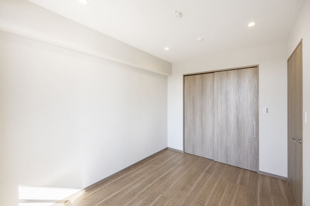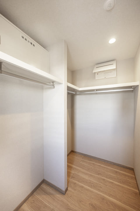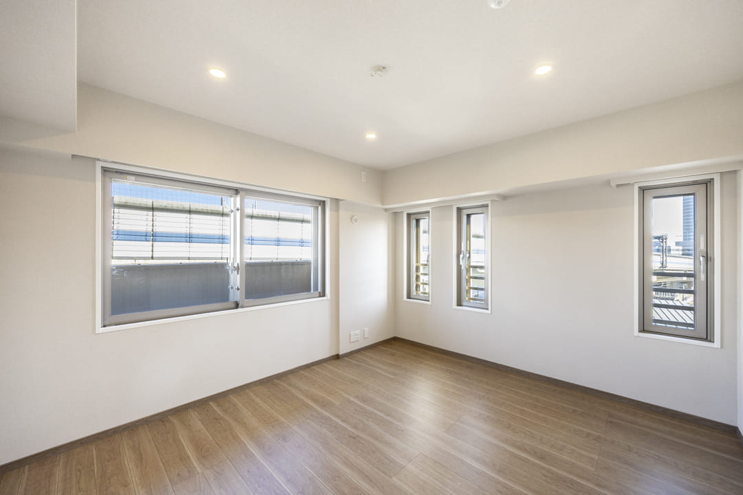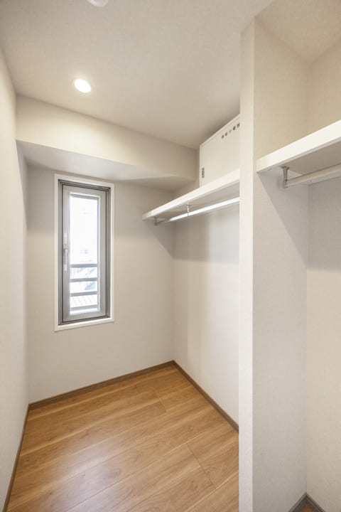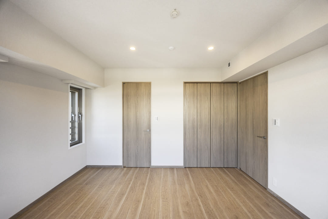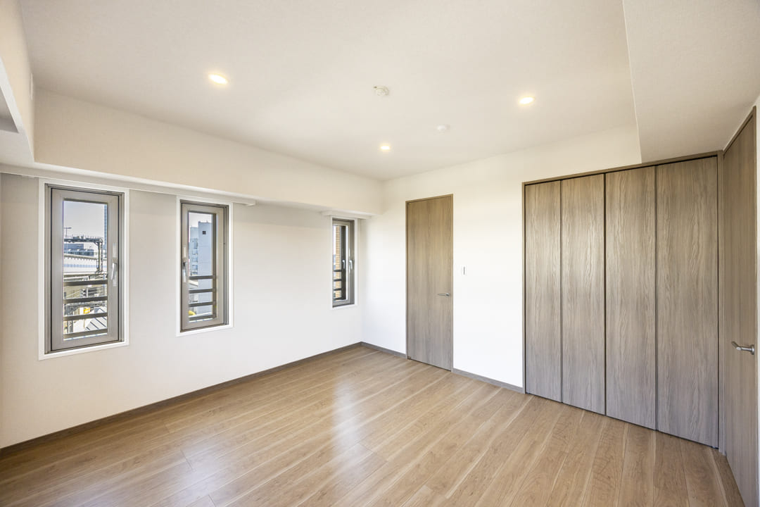 約9.0帖の洋室1は、ゆとりがあって主寝室に良さそうなお部屋です。二面採光のため通風も良好。また、クローゼットだけでなく、ウォークインクローゼットも造られているので、荷物をすっきりと収納することができます。