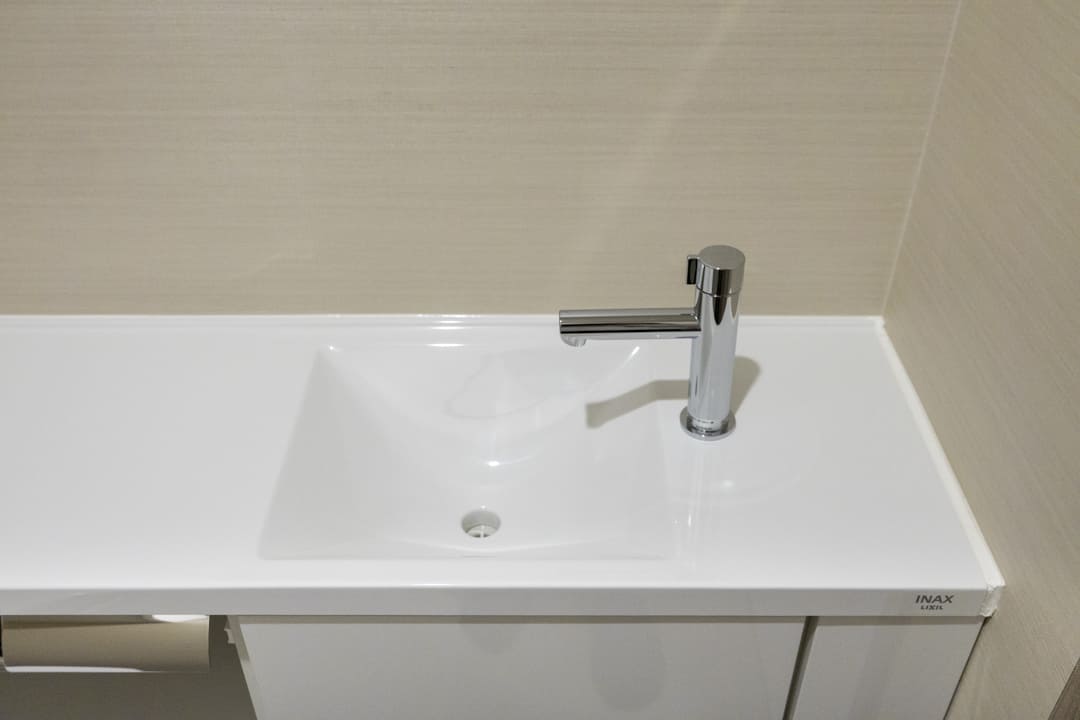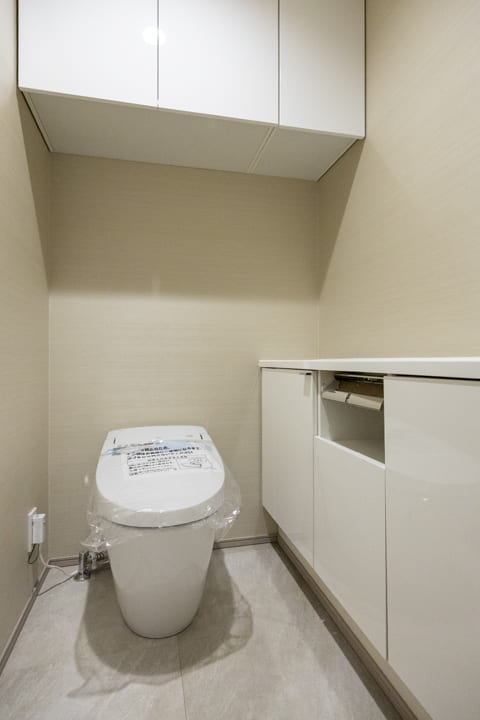 ウォシュレット一体型のトイレです。タンクレスタイプなのですっきりとした印象に。また、別途で手洗い器が造られているので、すぐに手を洗うことができて衛生的です。上部には吊戸棚が設置されていて、収納スペースもありますよ。カウンタースペースにはアロマなどを置いても◎。