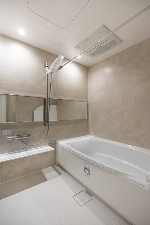 ブラウンの壁パネルが落ち着いた雰囲気を演出してくれている浴室です。お風呂にゆっくり浸かるのが好きという方に嬉しい追い焚き機能を搭載。家族の入浴時間がずれてしまっても安心です。また、浴室乾燥機には暖房・乾燥・換気・涼風の機能がついており、一年中快適に過ごすことができます。
