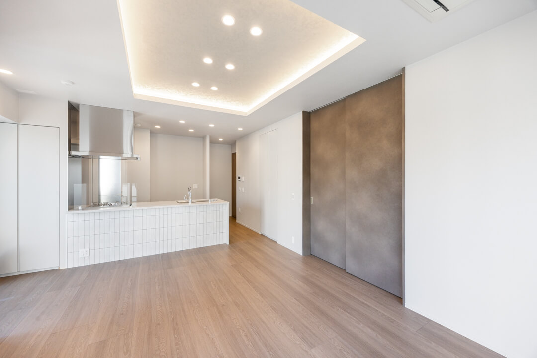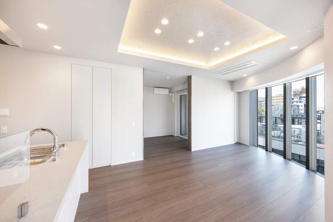 約14.2帖のリビングダイニングは家族でゆったり過ごせる広さです。空間の印象を決める開放感あふれる窓。景色がクリアに見える北向きです。周辺のビルとは距離が保たれていて、リビングからも見晴らしも良好です。折り上げ天井部分には間接照明が施されていて、空間をやさしい光で照らしてくれます。お部屋の演出性も高まりますね。