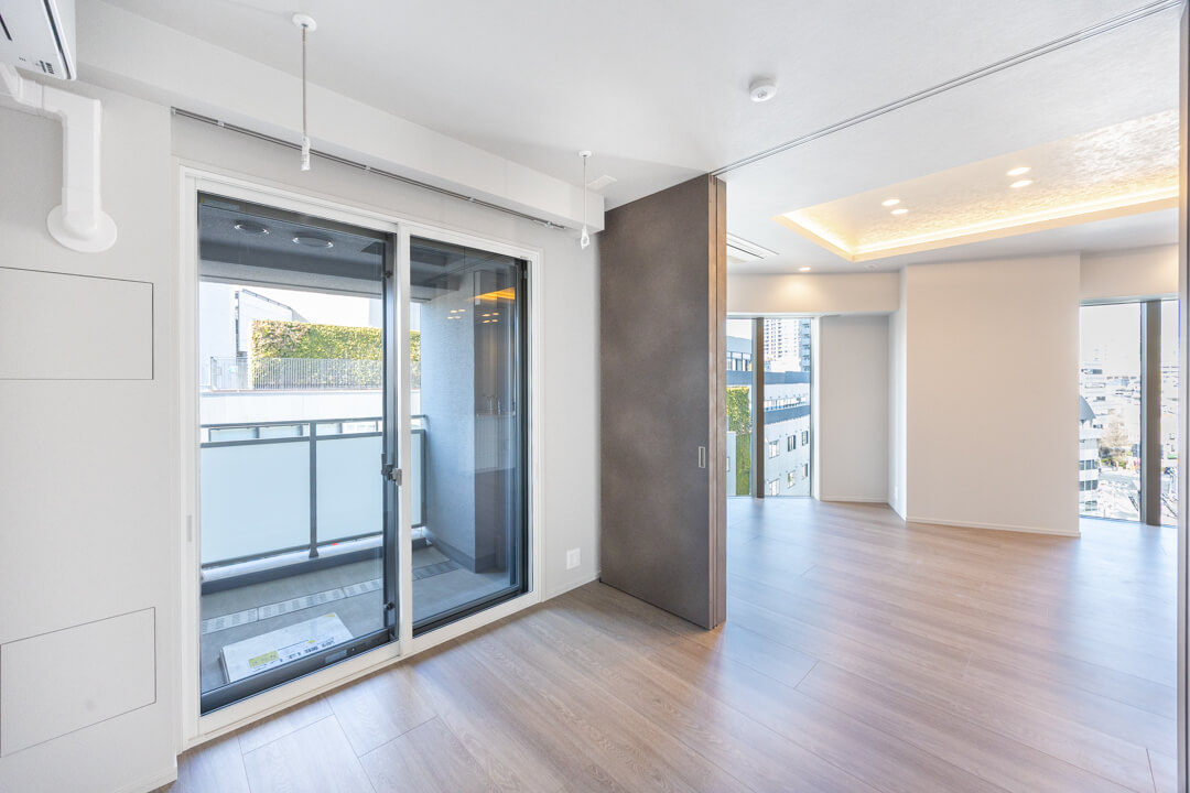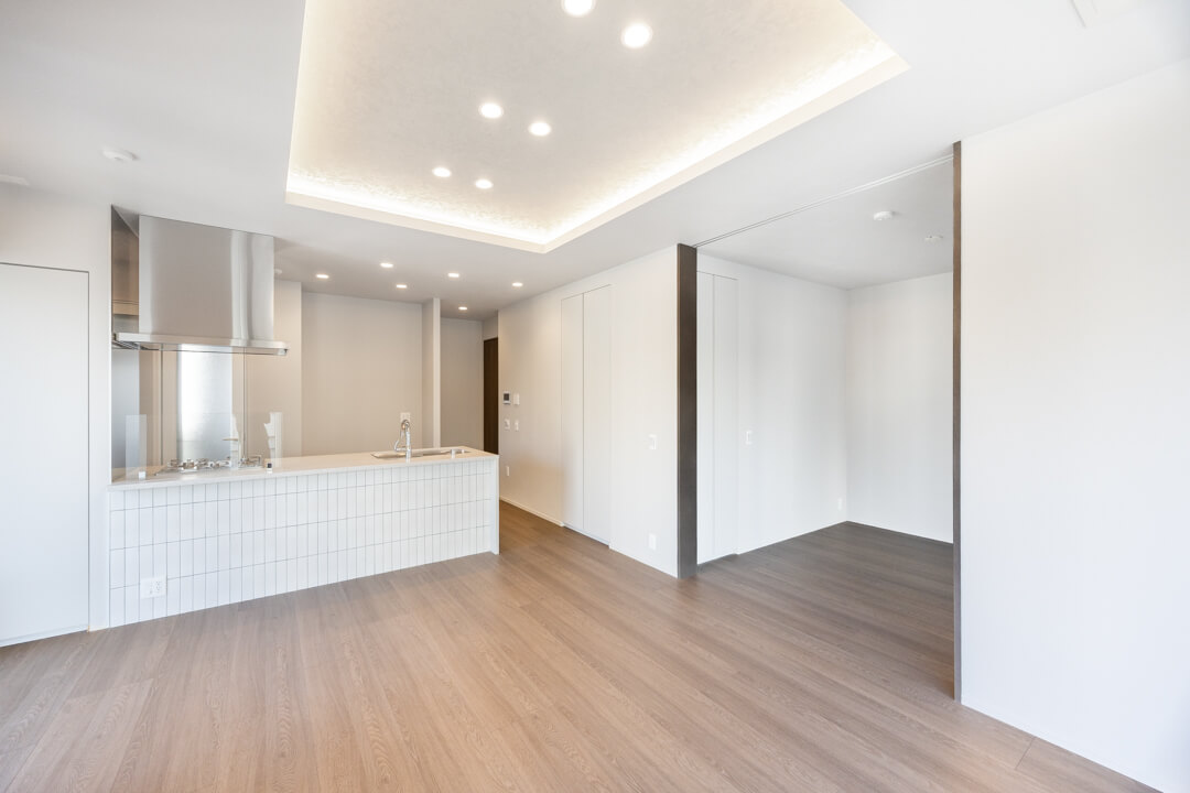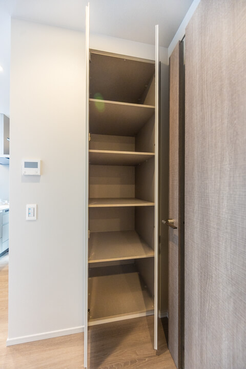 リビングと隣接している洋室と繋げてより開放的に過ごすことができます。床にドアレールがないので見た目もすっきりとした印象です。ライフスタイルに合わせて様々な使い方ができそうですね。また、リビングには計4つの物入が設けられて収納スペースが充実しています。