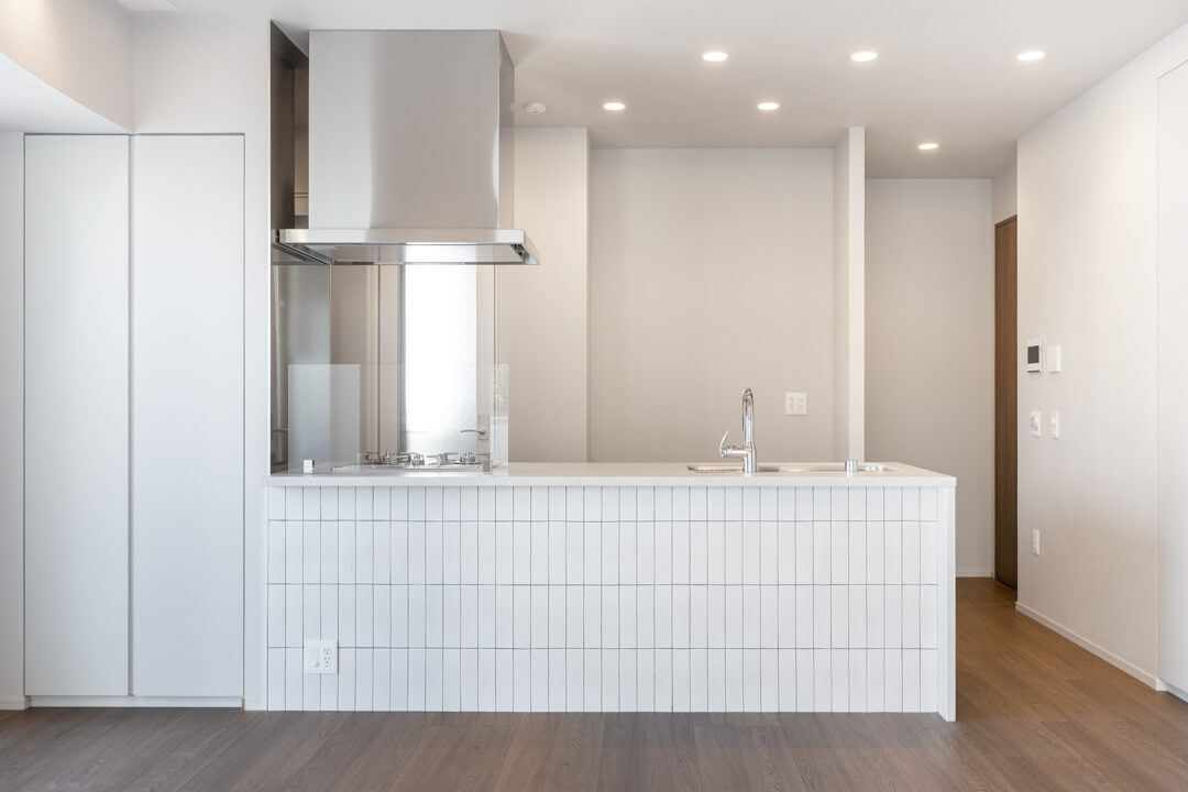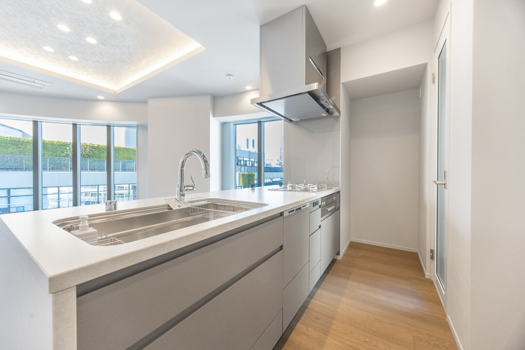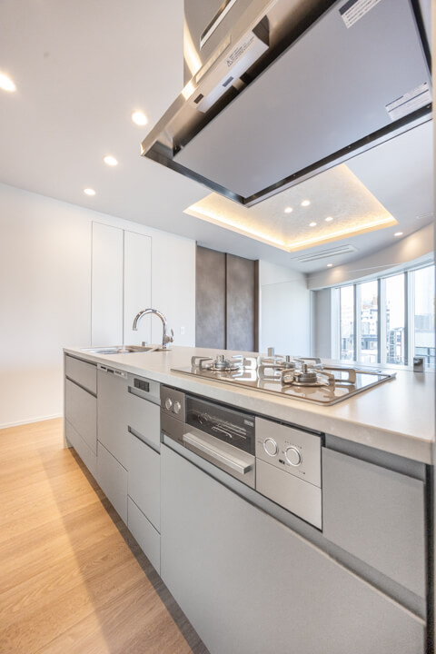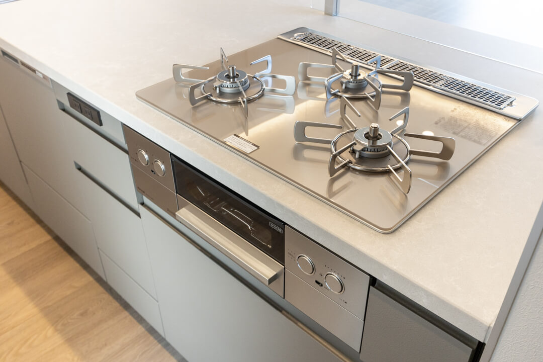 リビングダイニングが見渡せる開放的なオープンキッチン。家族やゲストとコミュニケーションが取りやすく、小さなお子さんがいるご家庭では子どもの姿も見守れます。リビング側の面材がタイル貼りになっていてお洒落な印象も◎。料理が捗る3口ガスコンロ、家事の時短に心強い食洗機、生ゴミの処理に便利なディスポーザー付きで設備も充実。キッチンの勝手口はバルコニーへ通じています。