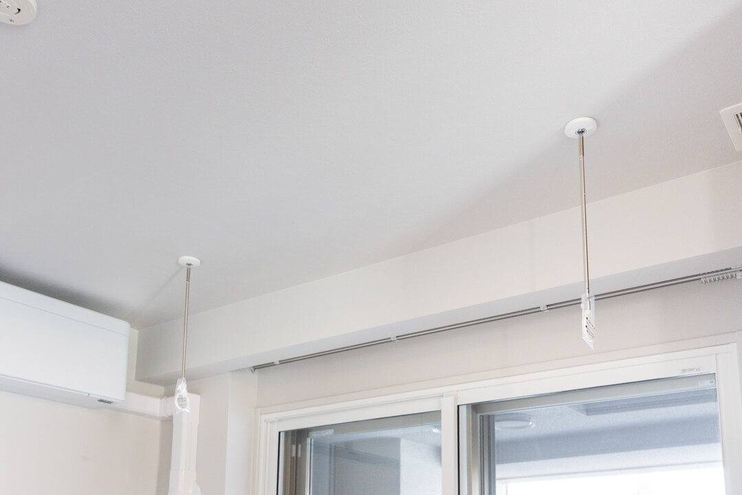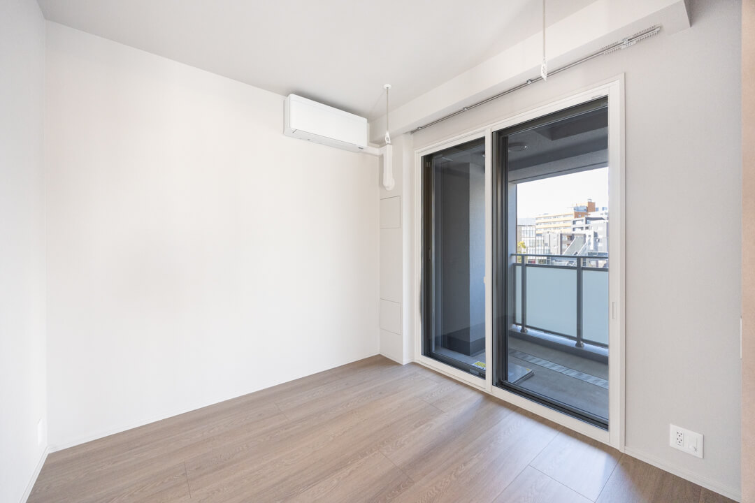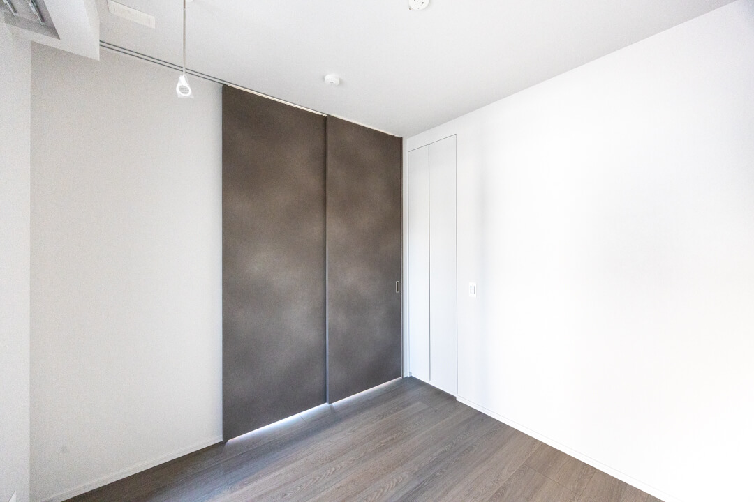 リビングダイニングと隣接した約5.0帖の洋室。扉の開口幅が広く、空間を繋げてより広々過ごせます。床にドアレールがないので見た目もすっきりとした印象。レールにホコリがたまる心配もないので衛生的にも◎です。窓際の天井部には室内干し用の洗濯金物が付いていて、雨の日や冬場の洗濯にも困りません。クローゼットも付いています。