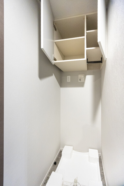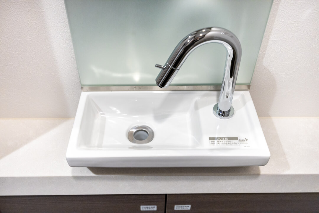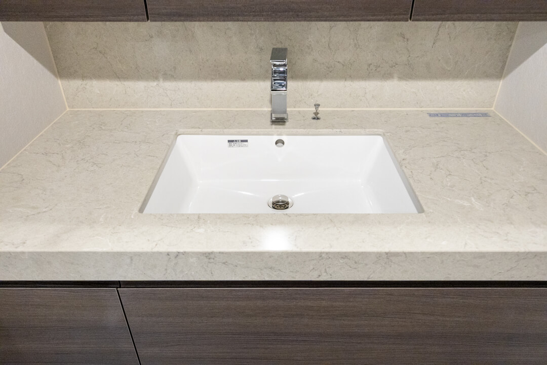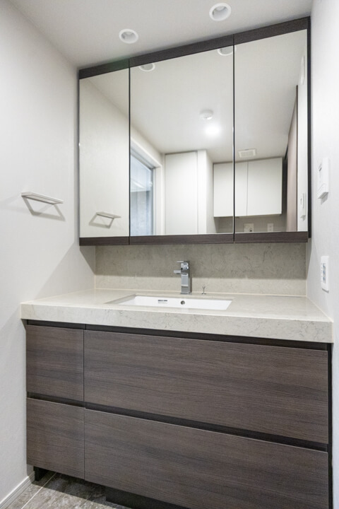 洗面化粧台は洗面まわりの小物がすっきり整頓できるミラーボックスや、モノの出し入れがしやすい引き出し式のキャビネット付きで使い勝手の良さもポイント。別途リネン庫も設置されていて、収納スペースが充実しています。