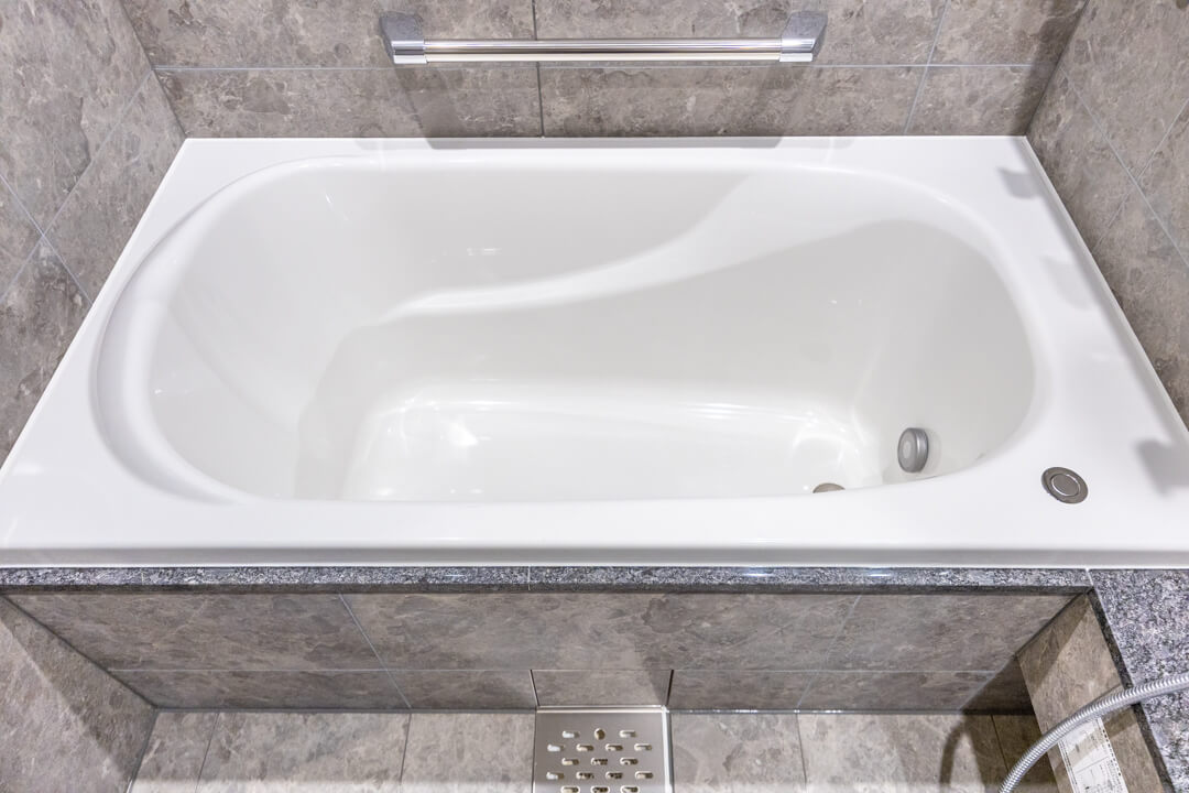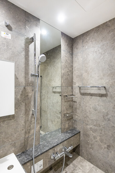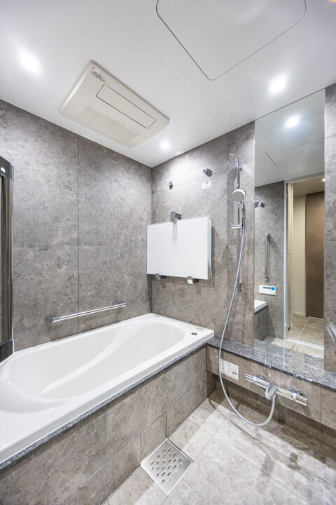 1418サイズのバスルーム。ストーン調で重厚感と上質な雰囲気が感じられます。追い炊き機能の他、乾燥・換気・暖房・涼風の4つの機能が備わっていて、一年中快適にバスタイムが楽しめます。
