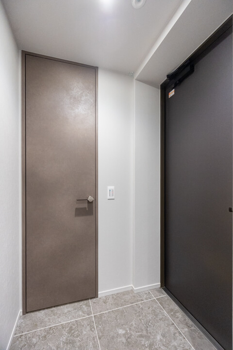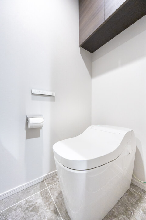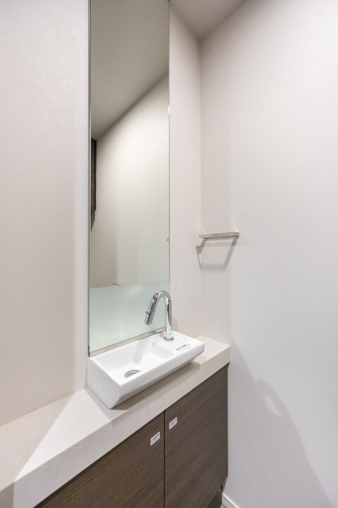 廊下に面したレストルーム。空間がすっきり見えるタンクレストイレです。手洗いカウンター、収納スペースも完備。ウォシュレットリモコンはスティック型でスタイリッシュな雰囲気です。