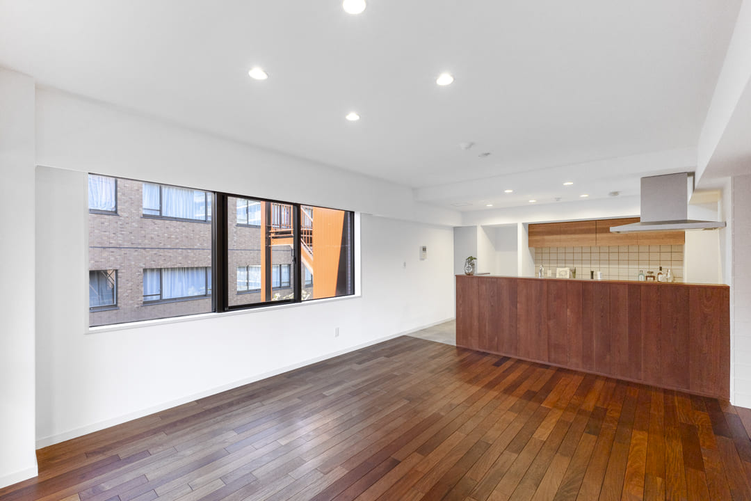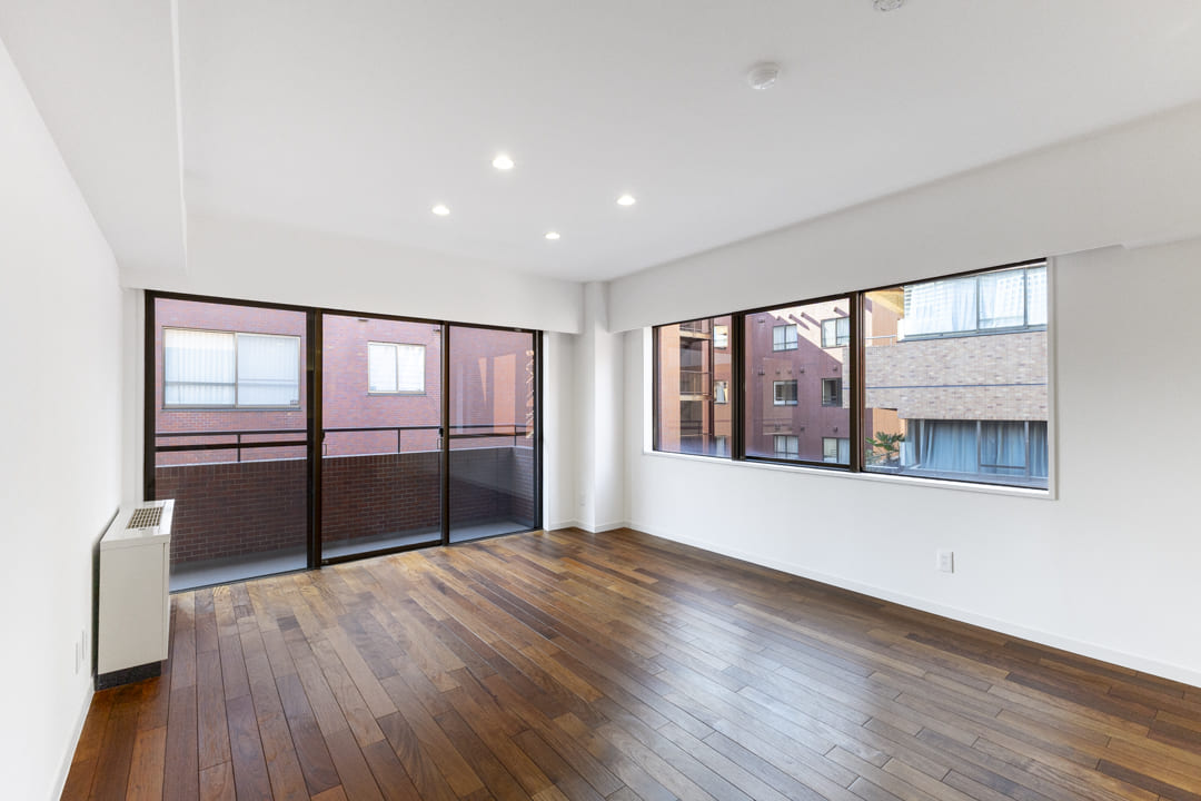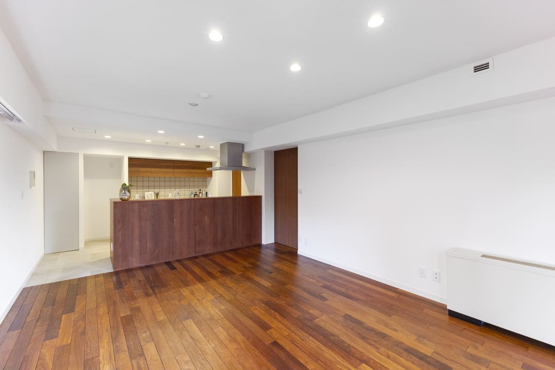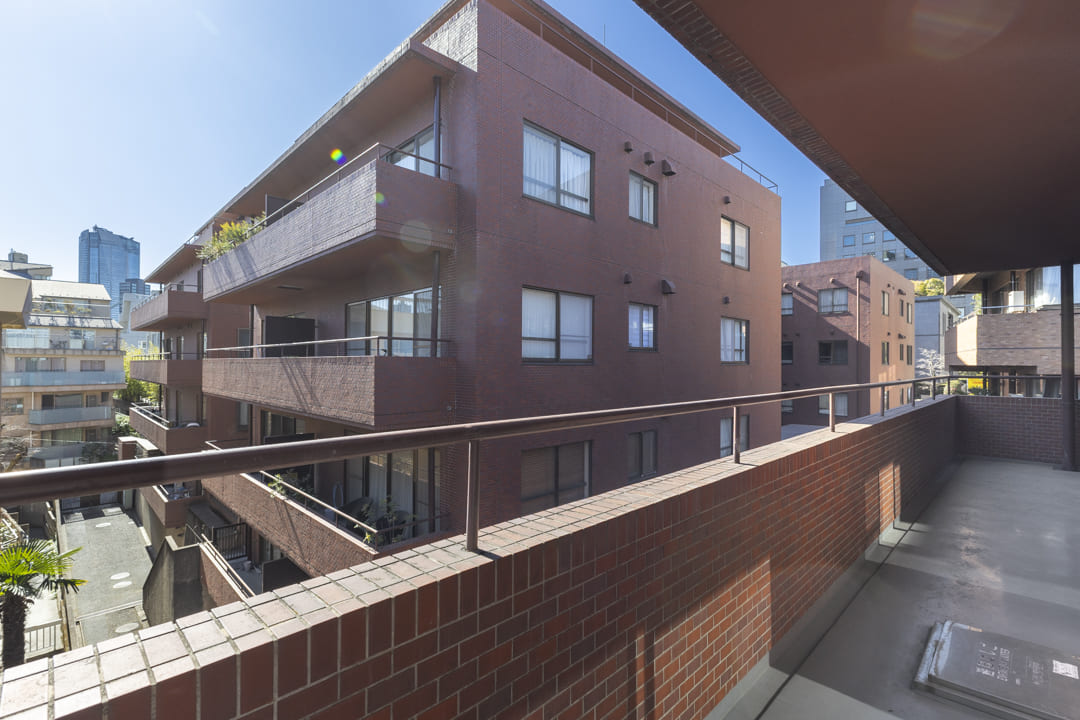 1979年竣工、重厚感ある外観が印象的なヴィンテージマンション。天然石をあしらったエントランスホールや内廊下設計など、ホテルライクな共用空間が上質な日常を演出します。「青山一丁目」駅、「乃木坂」駅より徒歩6分。外苑東通りから一本入った静かな住環境で、都心の利便性と落ち着きを兼ね備えています。今回ご紹介するお部屋は4階部分、専有面積74㎡の2LDK。全居室南向きの角住戸です。南西2面採光のLDKは約18.6帖のゆとりがあり、無垢材フローリングの温もりが心地よい空間。回遊性のあるキッチン動線や約10mのワイドバルコニー、廊下設置の洗面台など、日々の快適さにも配慮された住まいです。細則はありますが、大切なペットと一緒に暮らすことができます。