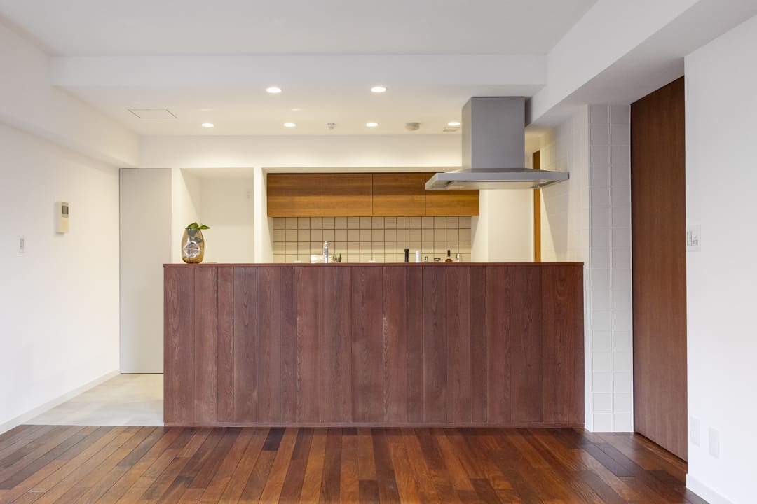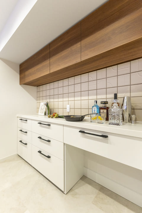 開放感のあるオープンキッチン。家族との会話を楽しみながら調理ができ、暮らしに自然なつながりを生み出します。立ち上がり壁が手元をさりげなく隠し、生活感を抑えられるのも嬉しいポイント。リビング側は木目調のデザインを採用し、家具のように空間に美しく調和しています。キッチン側は白を基調とした仕上げで、清潔感のあるすっきりとした印象です。