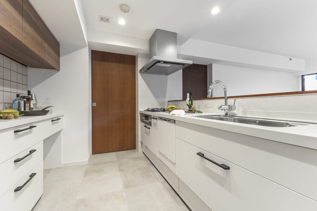 リビングダイニングに接続するキッチンですが、奥にも扉があり、廊下に繋がっています。玄関や洗面室への動線もスムーズで、買い物帰りに食材を運んだり、料理中に洗濯やお風呂掃除をしたい時にも便利。家事効率が上がりそうです。