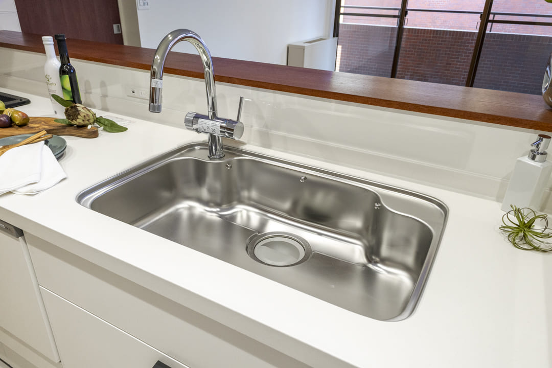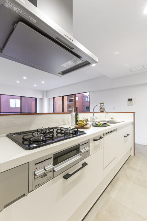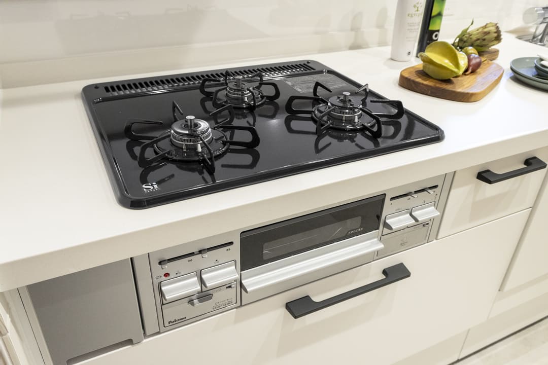 調理の際に手軽においしい水を使用できる浄水器一体型水栓や、後片付けの捗る食洗機付き。グリル付3口ガスコンロも付いていて、快適なキッチン時間をサポートしてくれます。