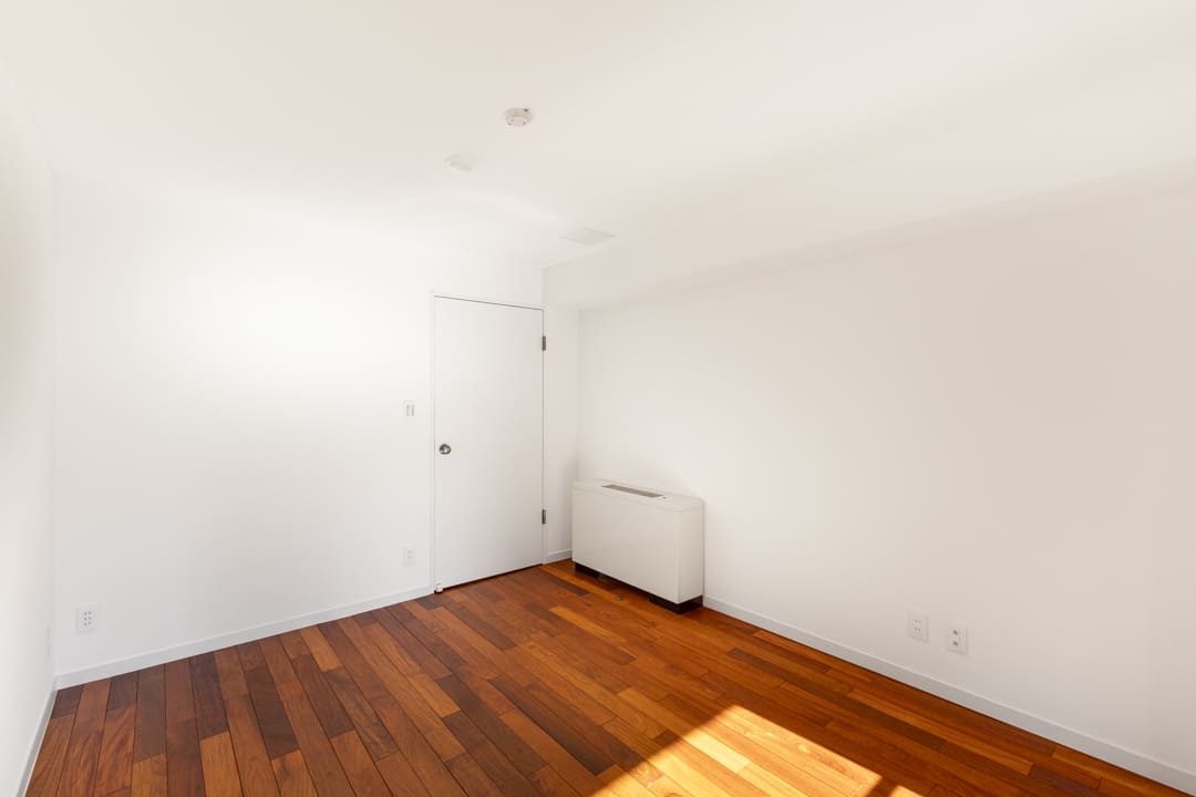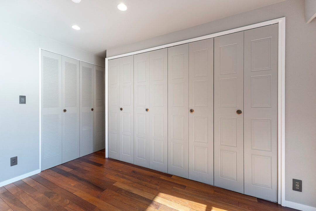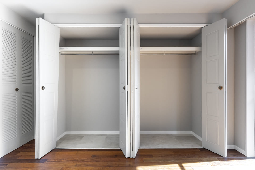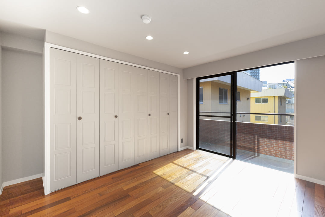 約7.0帖の寝室。バルコニー付きのゆとりある空間で、主寝室にぴったりです。南向きの窓からあたたかい光が降り注ぎ、すっきりと目覚められそうですね。クローゼットを3ヶ所に備え、収納性の高さも魅力。荷物を整理整頓し、居室空間を有効活用できそうです。