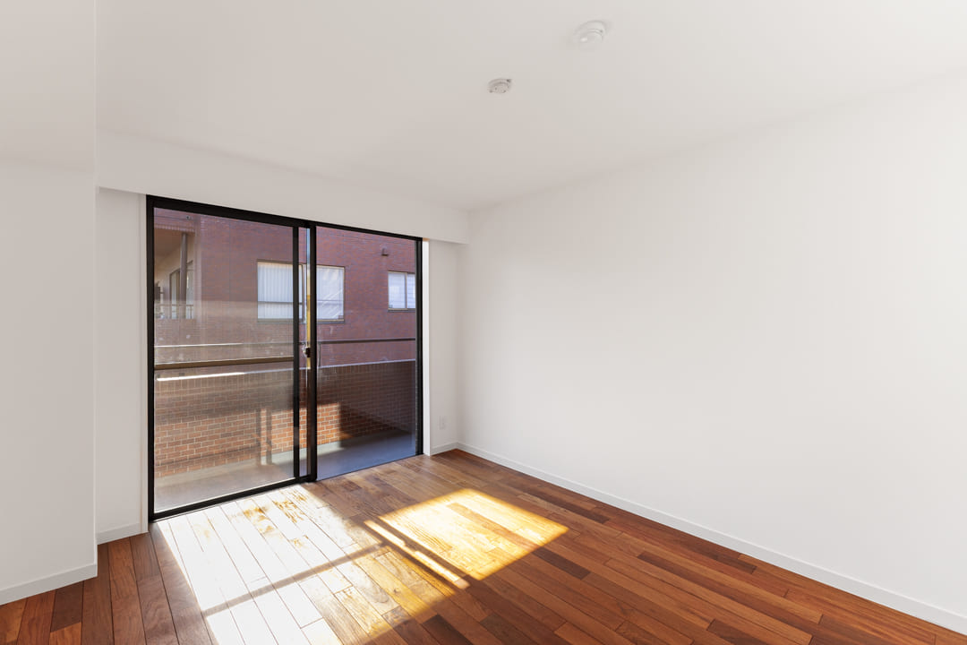 約6.9帖の洋室。南向きの窓から明るい陽光が差し込み、心地よい時間を過ごせる空間です。バルコニーに面しているため、視線が抜けて奥行きと開放感を感じられるのも魅力。収納を設けないことで居室スペースをゆったりと確保しており、自分好みの家具レイアウトを楽しめます。寝室としてはもちろん、ワークスペースや趣味のお部屋としてもおすすめです。