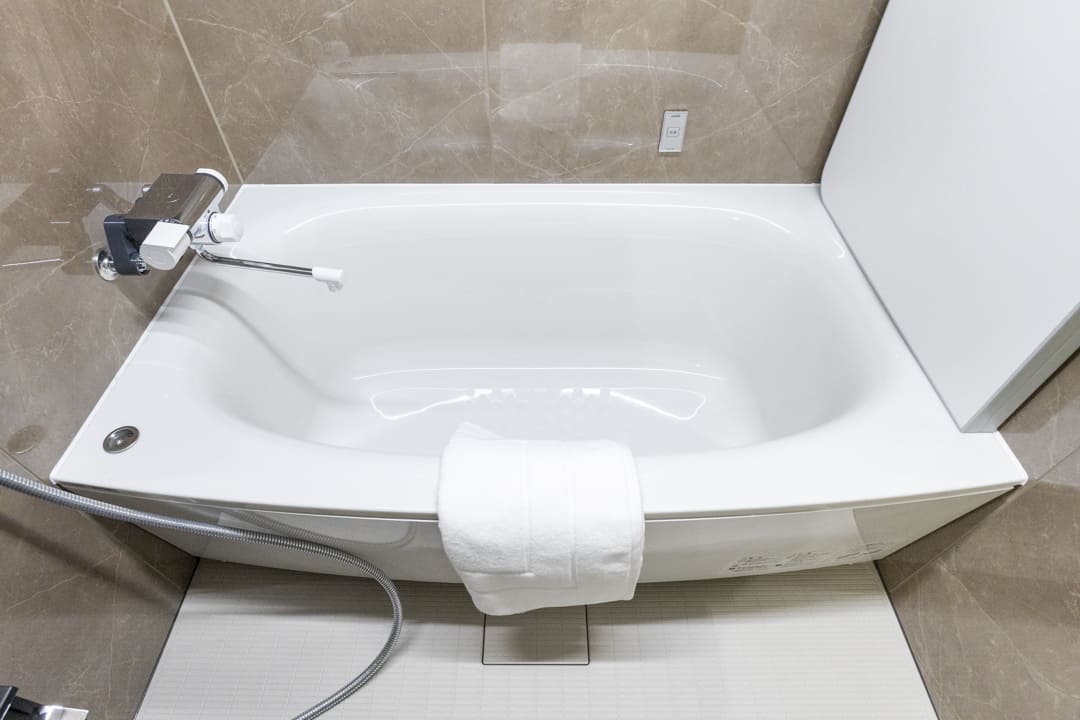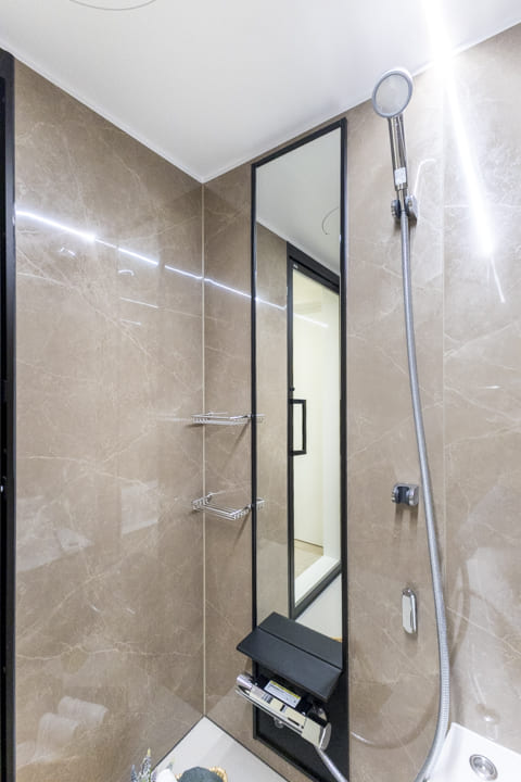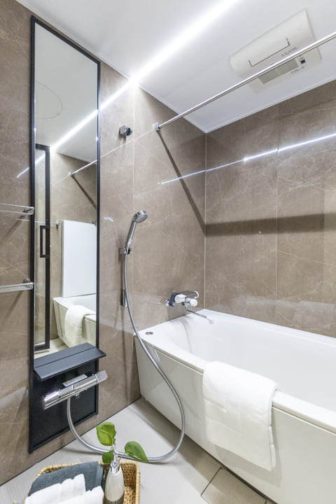 1416サイズのバスルーム。石柄の壁パネルとライン照明がスタイリッシュな雰囲気を演出します。照明には調色機能が付いているので、気分やシーンに合わせて使い分けができますよ。換気・暖房・乾燥・涼風機能搭載で、1年中快適なバスタイムをお過ごしいただけます。