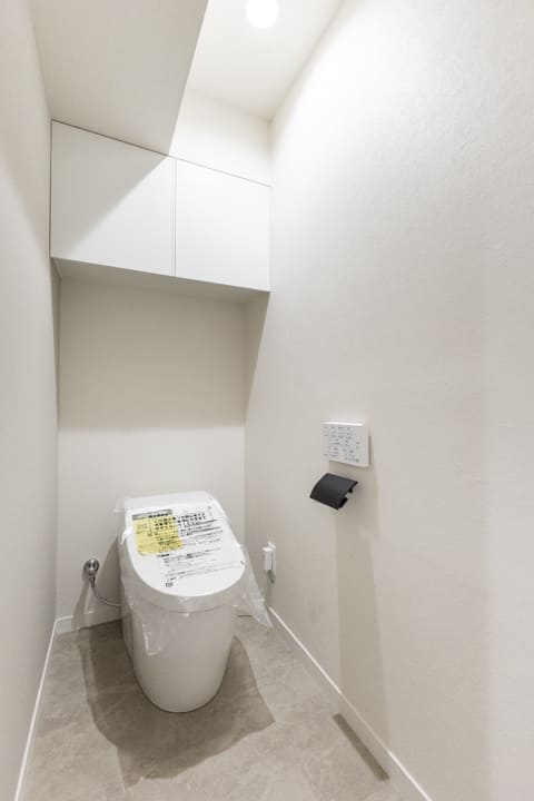 廊下に面していて独立性の高いレストルーム。TOTO製の洗浄機能付トイレに交換済みです。背面には吊戸棚を備え、トイレットペーパーや掃除用品をすっきり収納できるのも嬉しいポイントです。