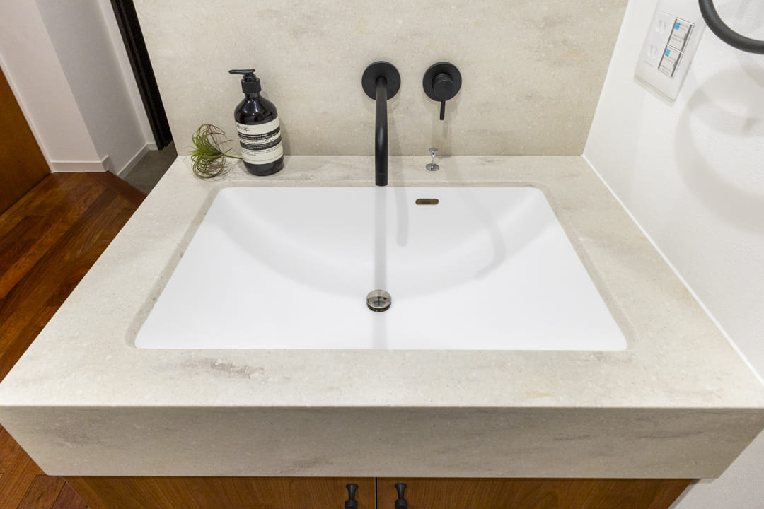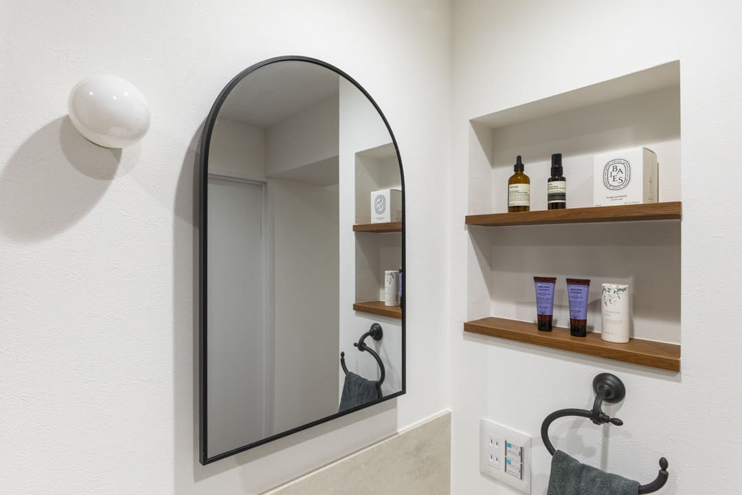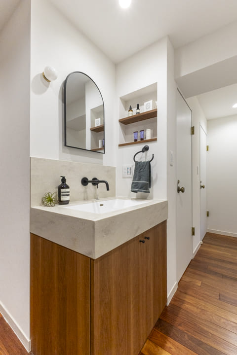 洗面化粧台は廊下に設けられ、帰宅後すぐに手洗いができる衛生的な動線が魅力。丸みを帯びたミラーがやさしいアクセントとなり、空間に洗練された印象を添えています。ハンドクリームやディフューザーなどの小物を美しくディスプレイできる可動棚付きなのも、嬉しいポイントです。