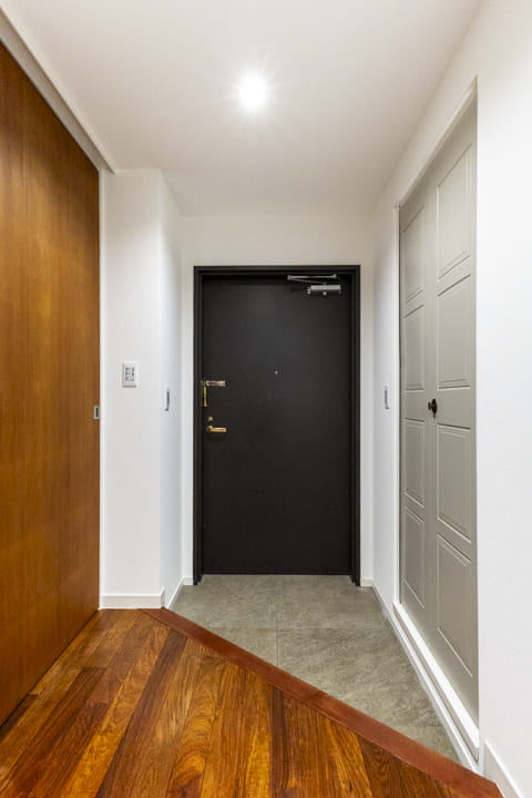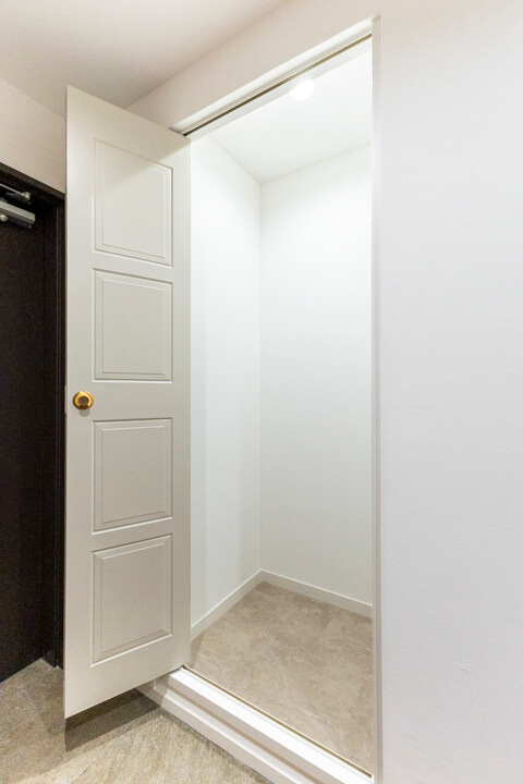 人感センサー搭載でいつも明るく出迎えてくれる玄関。荷物で両手が塞がっている時や夜遅く帰宅した時に、スイッチを探す手間がかからず助かります。入って右手にはシューズクローゼットがあり、靴はもちろん、雨具などもすっきり収納可能です。斜めのラインを描く上がり框が、玄関にさりげない個性とリズムを添え、視覚的な広がりと快適な動線を演出しています。