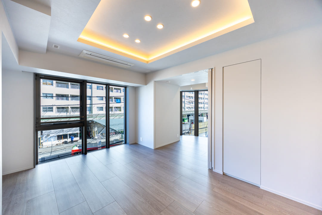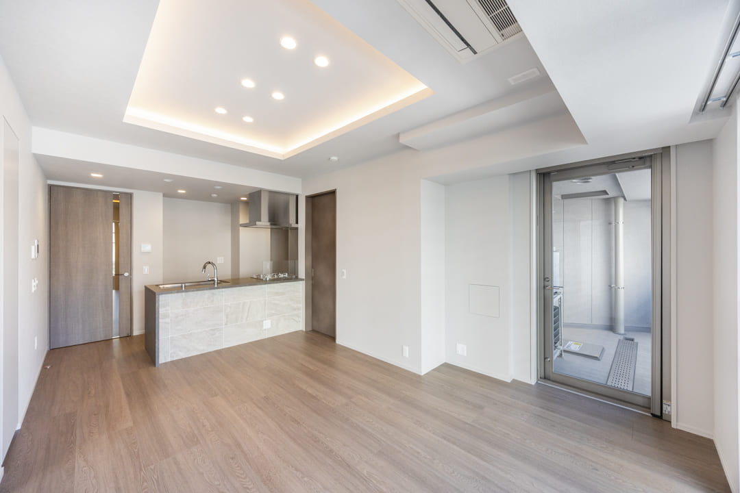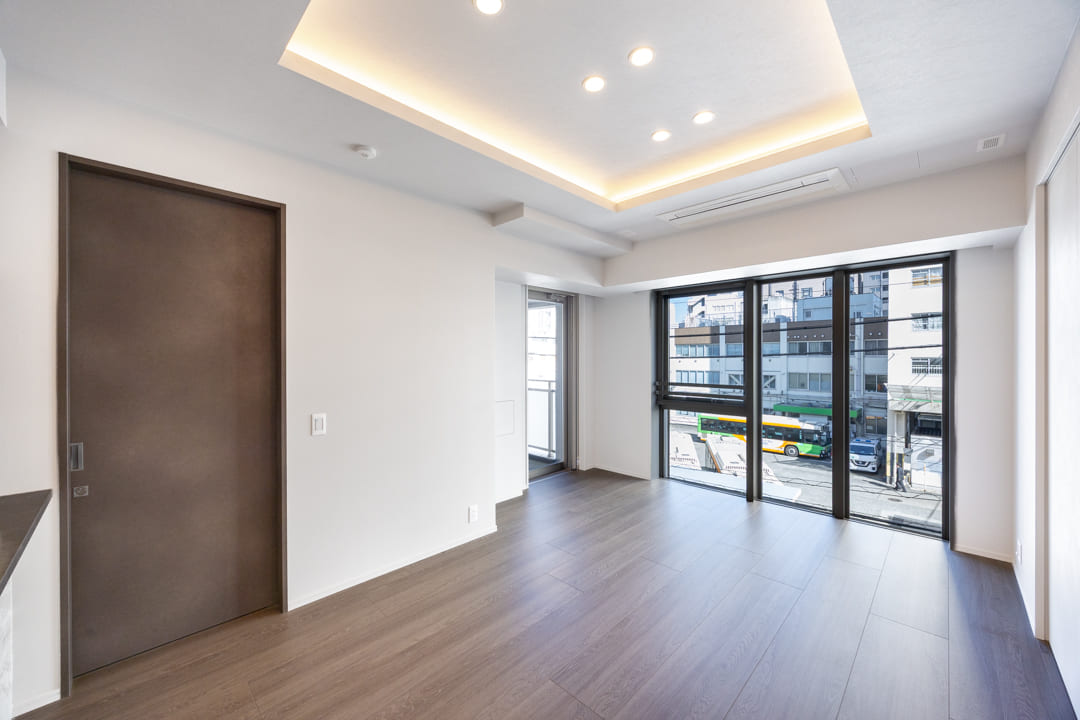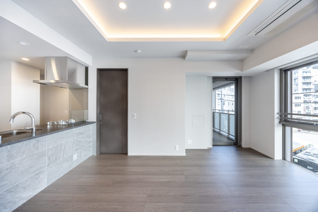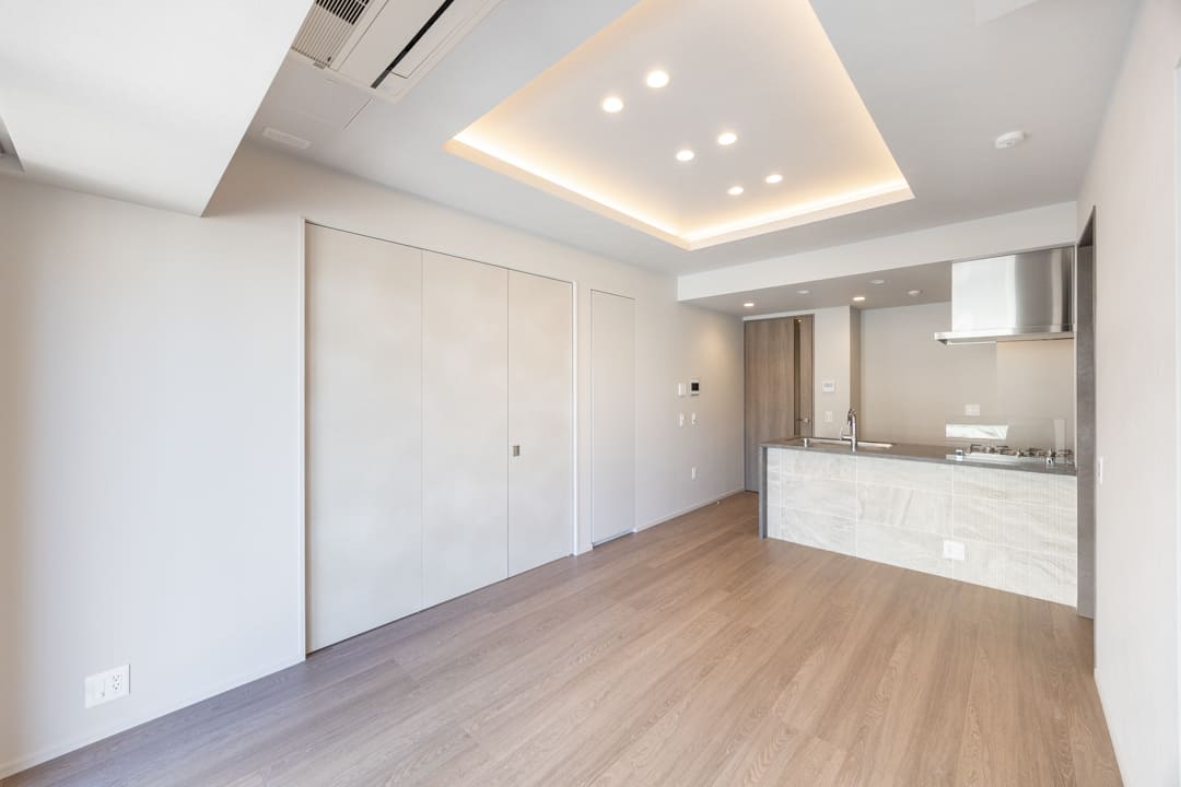 約13.8帖のLDK。2面採光によりやわらかな自然光が差し込む、明るく心地よい空間です。白を基調とした内装に、自然な風合いの木目フローリングを組み合わせ、さまざまなテイストの家具と調和しやすいデザインに仕上げています。お手持ちのインテリアともコーディネートしやすく、自分らしいお部屋づくりを楽しめるのも魅力。さらに、天井の間接照明がやさしい陰影を描き、空間全体に上品で洗練された雰囲気を添えています。