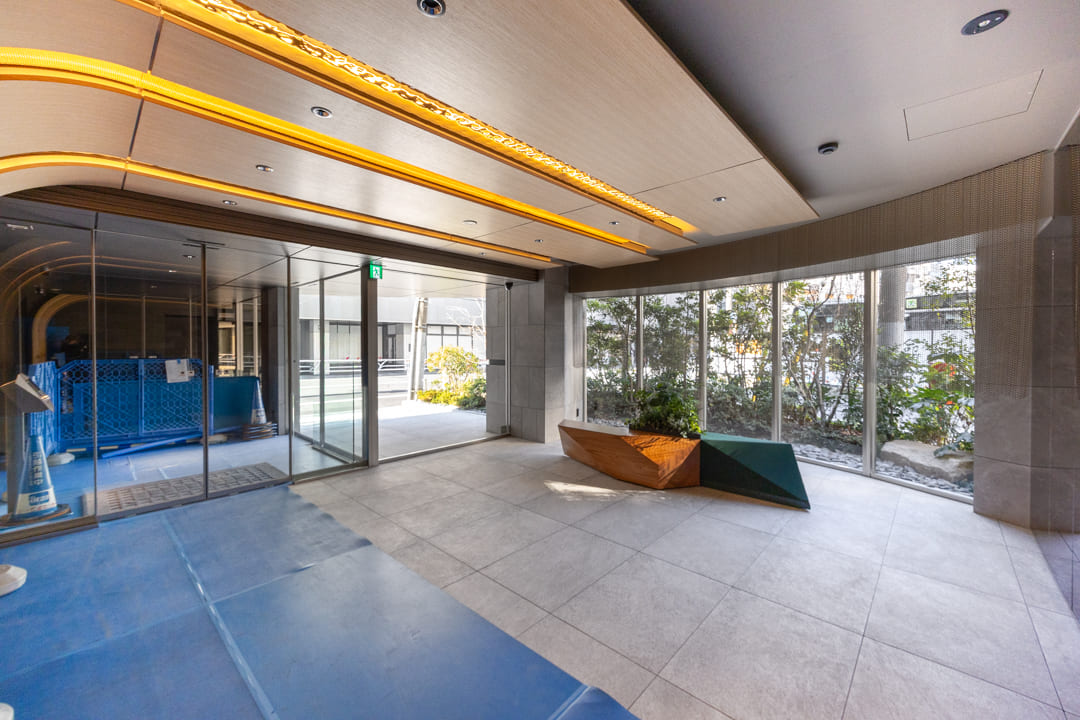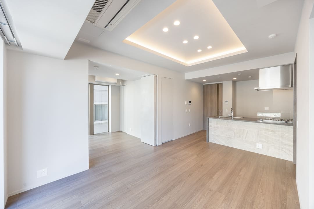 2025年7月に竣工した「プラウド渋谷東」。地上9階建・総戸数48戸のプライベート性に配慮された住まいで、「ZEH-M oriented」を取得した環境配慮型レジデンスです。オートロックや防犯カメラに加え、宅配ボックスも備え、安心と利便性を両立。ペットの飼育も可能で、大切な家族と暮らせるのも魅力です。渋谷・恵比寿・代官山の3エリアを日常使いできる利便性を享受しながら、明治通りから一歩奥まった落ち着いた住環境を確保しています。今回のお部屋は3階部分、専有面積61㎡の2LDK。新築未入居の角住戸です。リビングダイニングは2面採光で明るく、床暖房や間接照明が上質な寛ぎを演出。隣接する寝室と一体利用すれば、18帖超の開放的な空間になります。対面キッチンにはディスポーザー・食洗機を完備し、家事動線にも配慮。バルコニー2ヶ所付きで、快適な都市生活を叶えます。