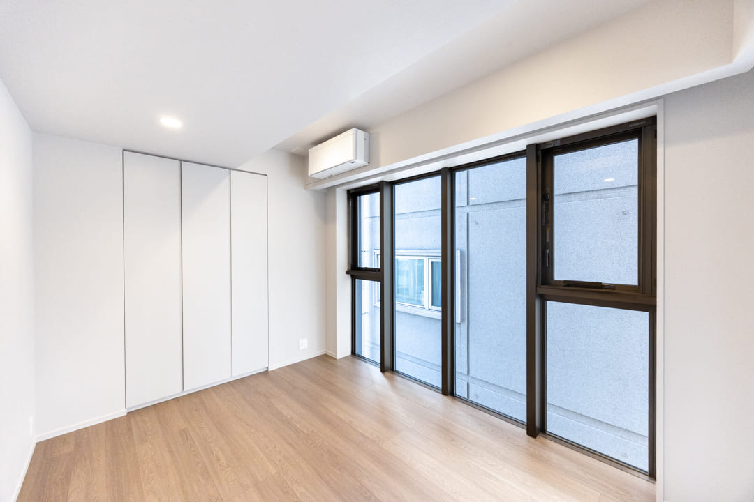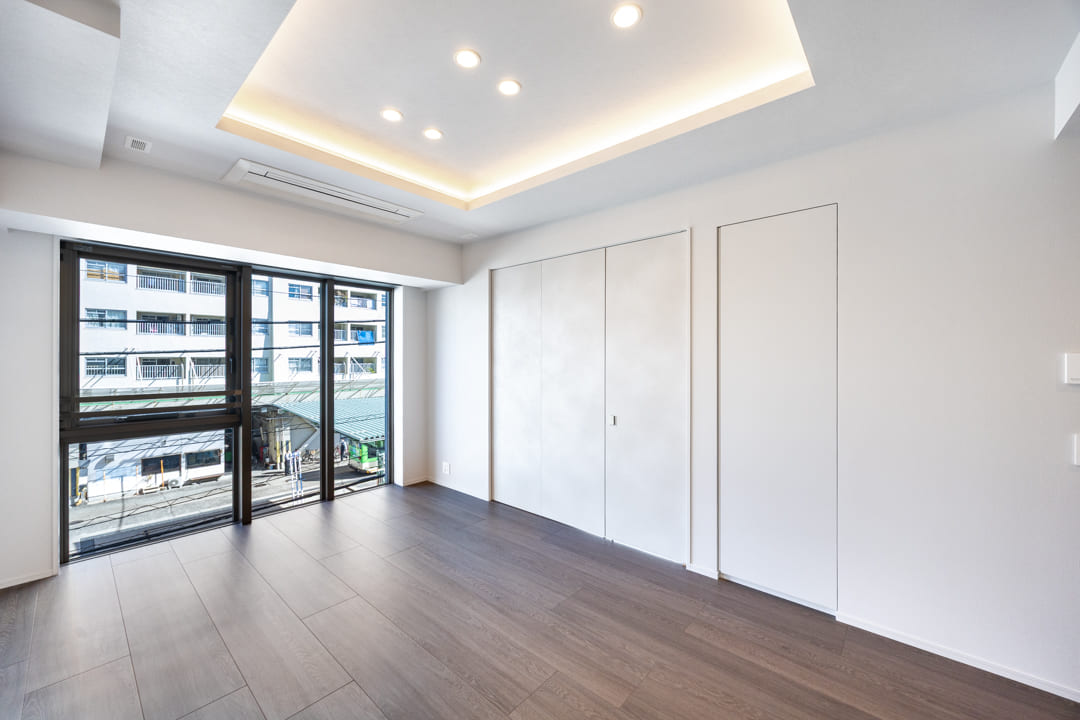 大開口の窓が開放感をもたらす寝室1。約7.0帖の広々とした空間です。廊下の突き当たりにあって独立性が高く、主寝室にぴったり。落ち着いて休めるプライベートスペースです。天井まで高さのあるクローゼットを備え、収納も充実しています。