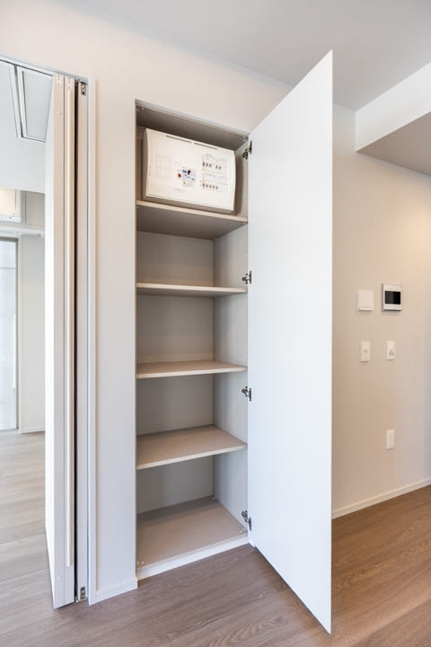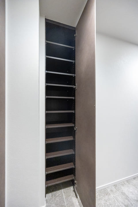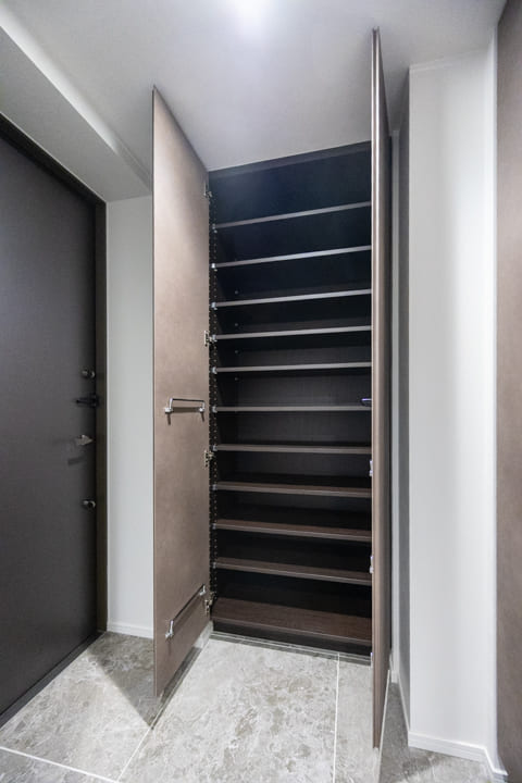 石調フロアが高級感を演出する玄関ホール。シューズボックスと2つの物入を備え、収納性に優れています。自由度の高い可動棚で、靴はもちろん、日用品ストックやペットグッズも収納可能。すっきりとした居住空間を実現できそうです。