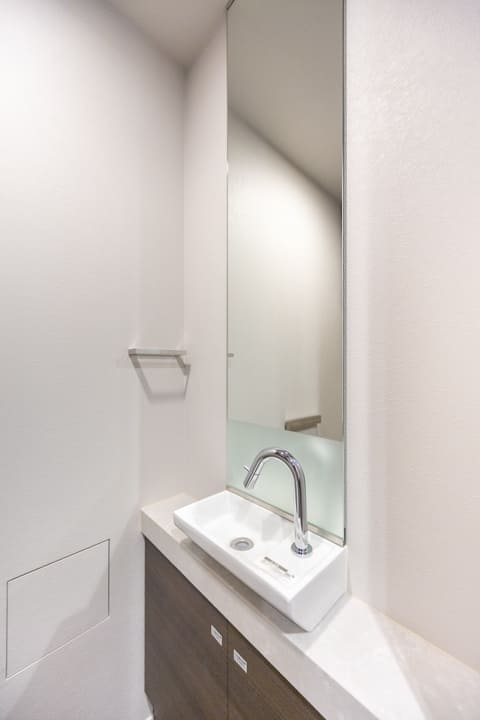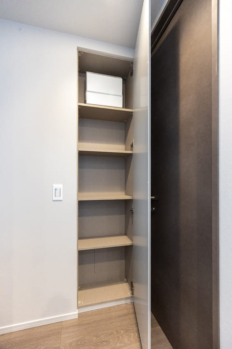 廊下に面していて独立性の高いレストルーム。スタイリッシュなタンクレストイレを採用しています。背面には吊戸棚とカウンターを備え、生活感が出る荷物はすっきり収納し、お花や小物を飾ることもできます。手洗いカウンター付きですぐに手を洗えるのも嬉しいポイントです。