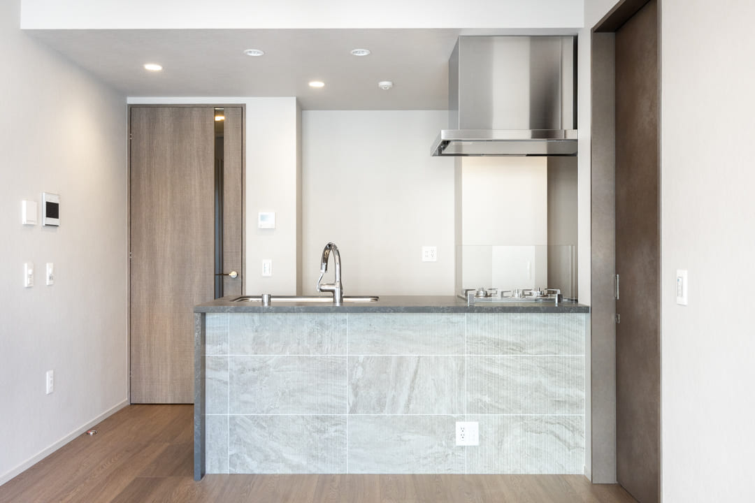 重厚感の漂う石調デザインが印象的なキッチン。開放的な対面タイプで、家族やゲストとの会話を楽しみながら調理ができます。コンロ前には油跳ねガードが設置されていて安心ですね。