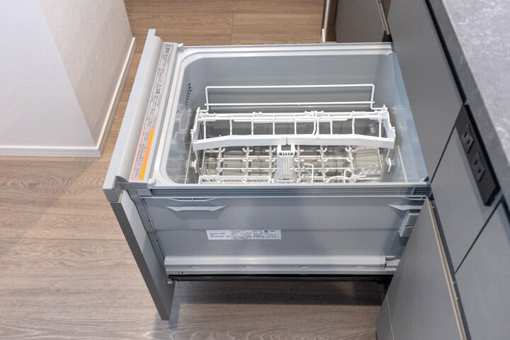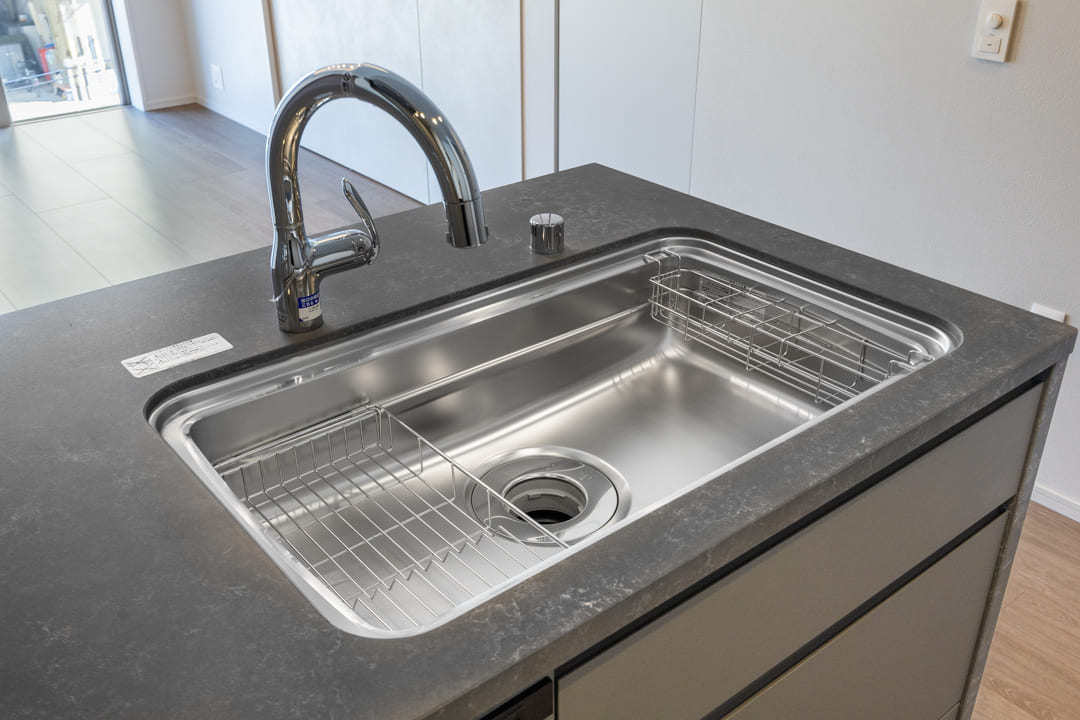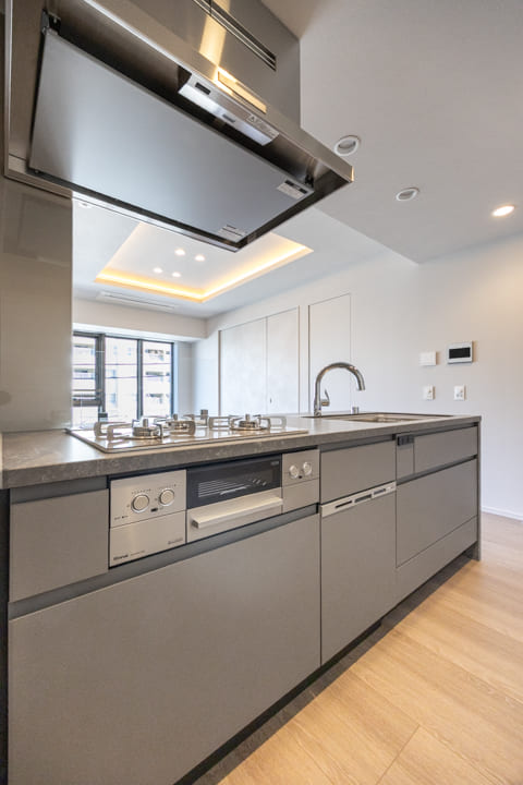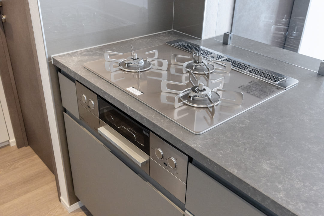 同時調理が叶うグリル付3口ガスコンロを内蔵。さらに、食洗機とディスポーザーも完備されています。料理後すぐに生ゴミを処理できるので、悪臭の原因を防ぎ、掃除の手間を軽減。食器洗いも捗り、後片付けの時短が叶います。