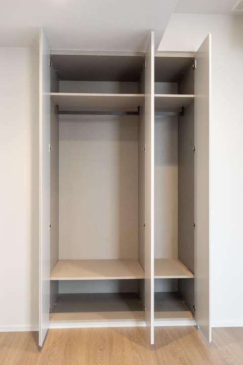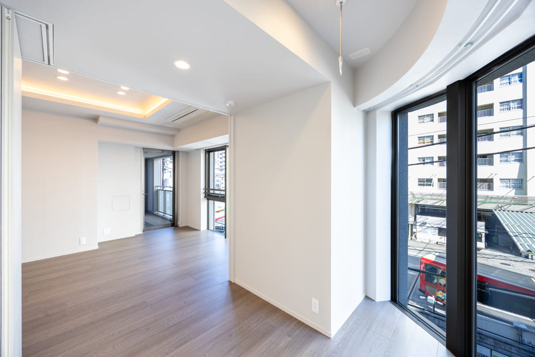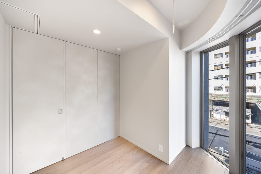 約5.0帖の寝室2は、アールを描くハイサッシが印象的な空間。やわらかな自然光が差し込み、心地よい明るさをもたらします。LDKとはウォールドアで仕切られており、扉を開放すればリビングと一体利用も可能。ワークスペースや趣味部屋といったプライベート空間としてはもちろん、拡張リビングとしても活用でき、ライフスタイルに合わせた柔軟な使い方が叶います。
