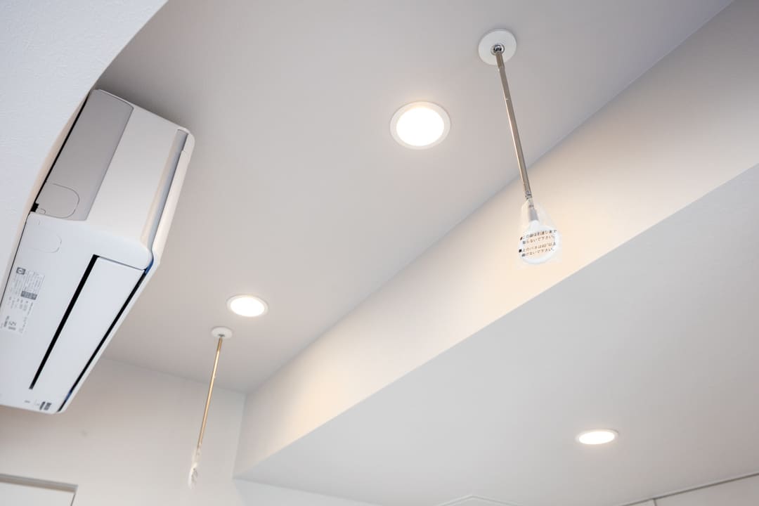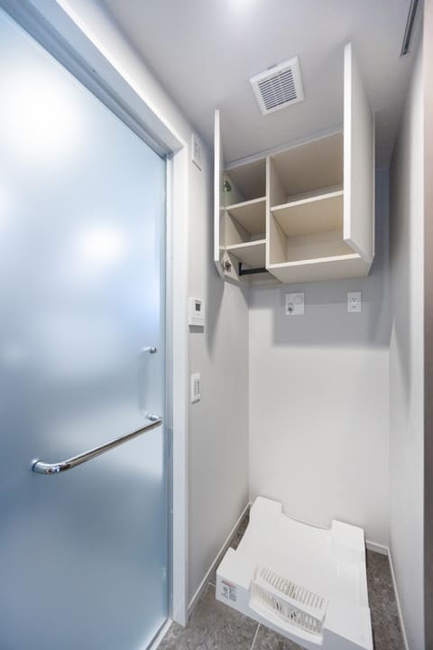 天井には室内物干しを備え、雨天時や日中に洗濯が難しい際に便利。未使用時には取り外しが可能で、空間をすっきりと保てるのも魅力です。