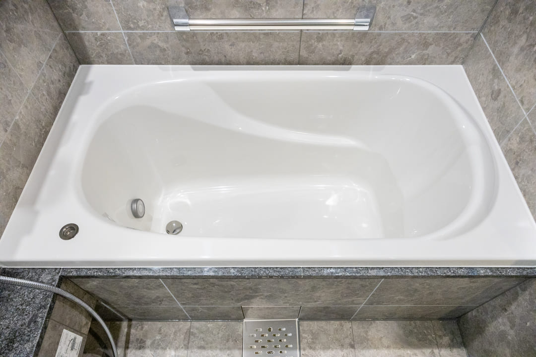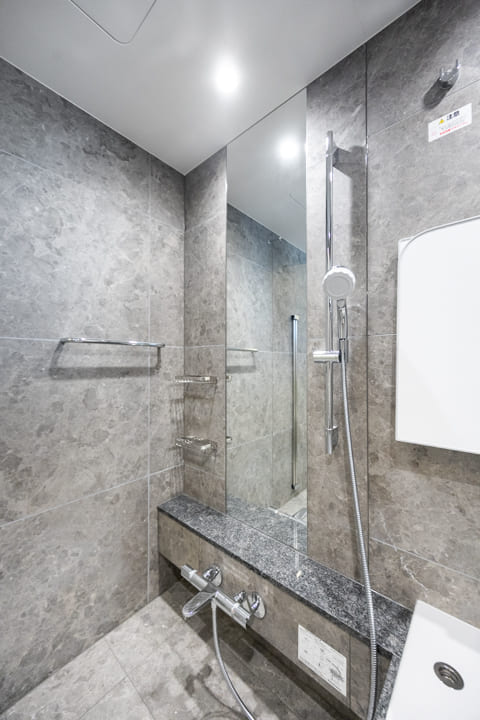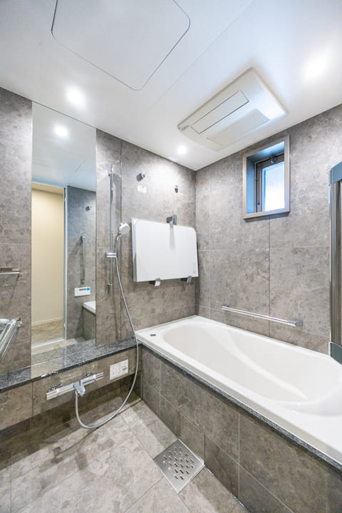 1418サイズのバスルーム。石柄で高級感の漂う空間です。窓から明るい光が入り、自然換気できるのも嬉しいですね。浴室換気乾燥暖房機に加え、追い焚き機能も搭載。ゆっくり半身浴をお楽しみいただけます。