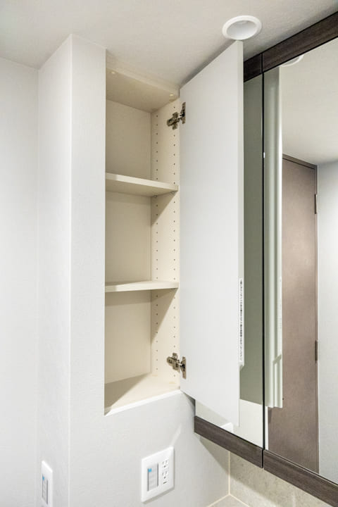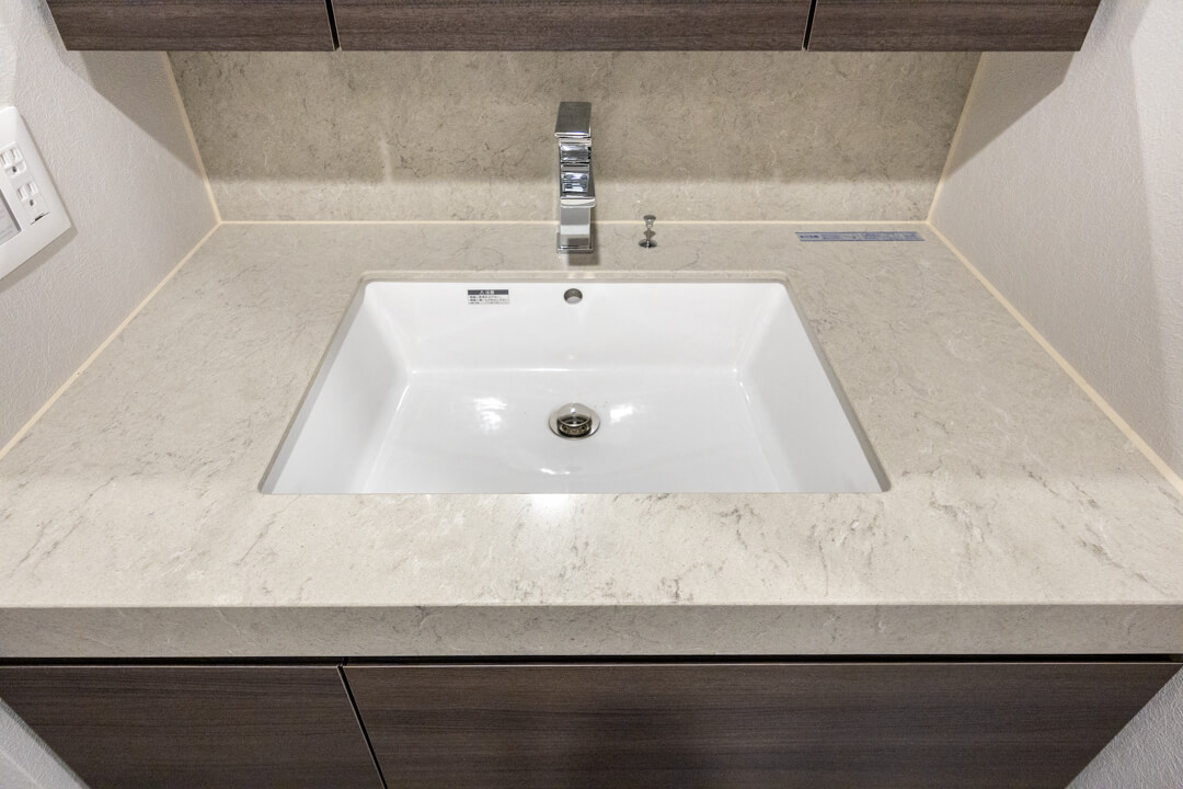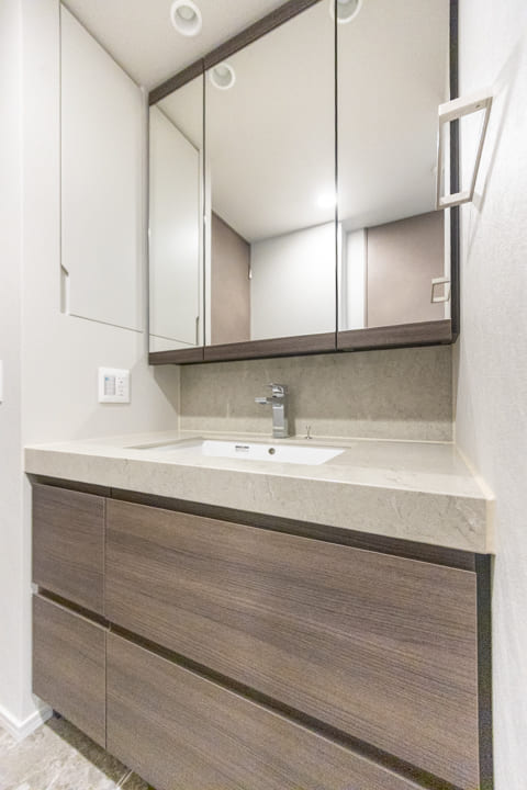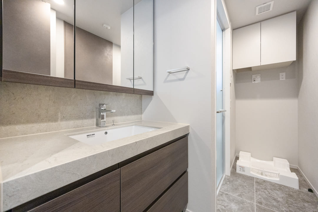 石調カウンターが美しい洗面化粧台。カウンタースペースにゆとりがあり、化粧品やドライヤーの仮置きが可能です。忙しい朝の身支度も落ち着いて行えそうですね。大きな三面鏡付きなのも嬉しいポイントです。奥には洗濯機パンが設置されていて、生活動線もスムーズです。