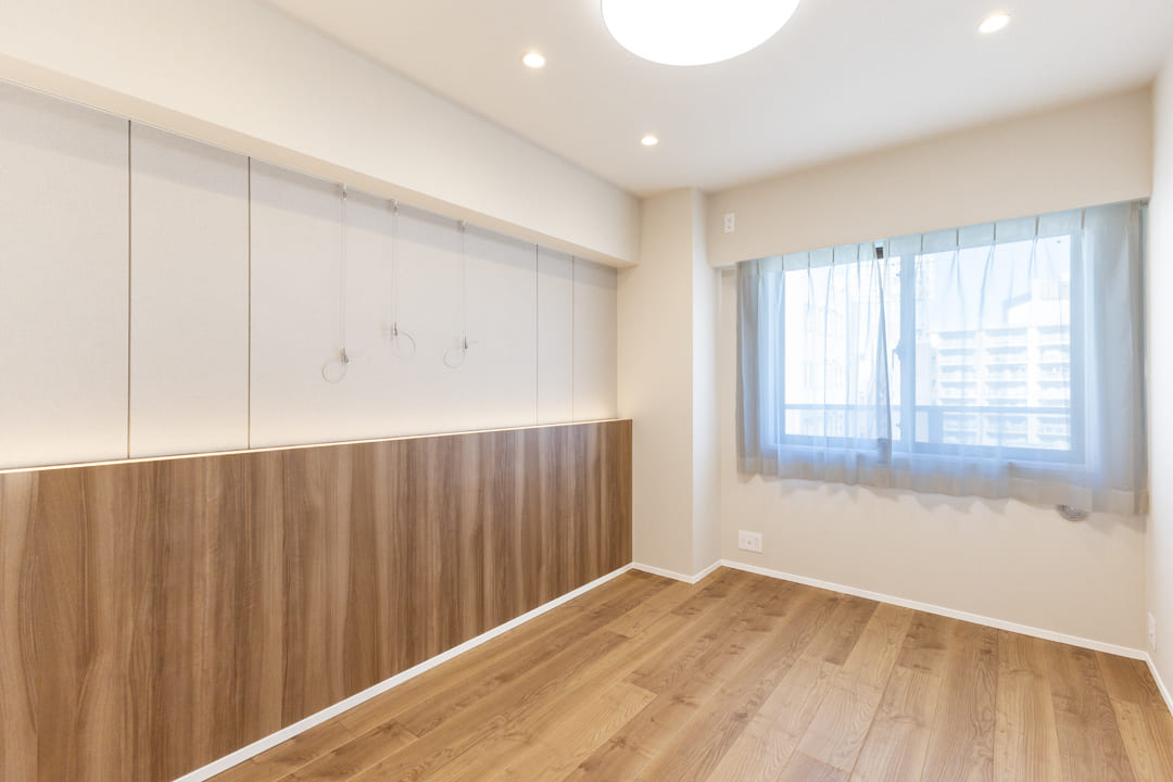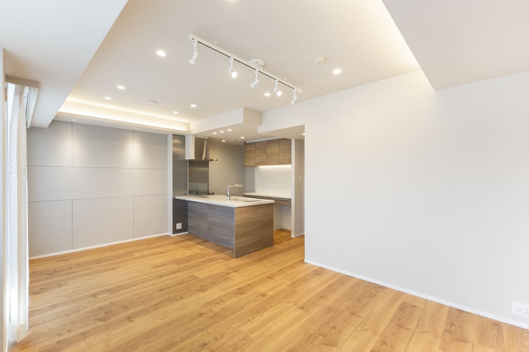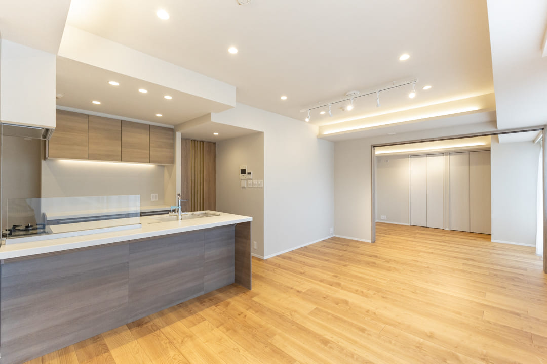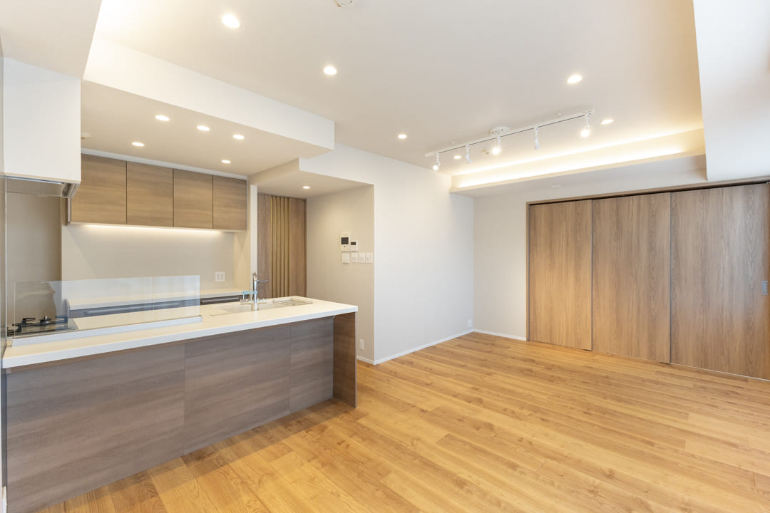 フローリングと建具には、木目の美しさが際立つ素材を採用。ナチュラルで洗練された内装に、天井の間接照明がやわらかな陰影を添え、空間全体に上品な雰囲気をもたらします。主張しすぎない色調のため、北欧・モダン・シンプルなど多彩なインテリアテイストと調和しやすく、現在お持ちの家具ともコーディネートしやすいのも特長です。