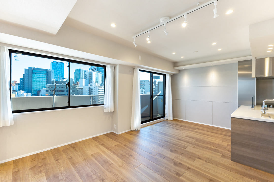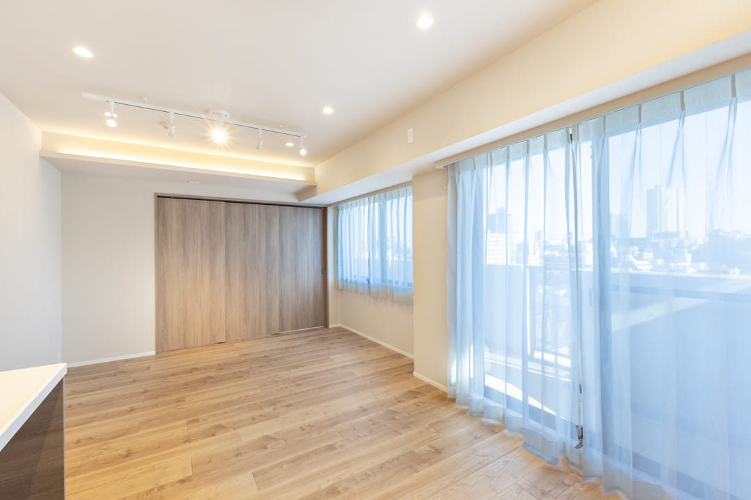 約15.0帖のLDK。東向きの窓からやわらかな自然光が差し込み、朝の時間を心地よく、活動的に過ごせる空間です。隣接する寝室との間仕切り戸を開放すれば、20帖超のゆとりある一体空間に。シーンに応じて広さを調整でき、ゲストを迎える際にも重宝します。