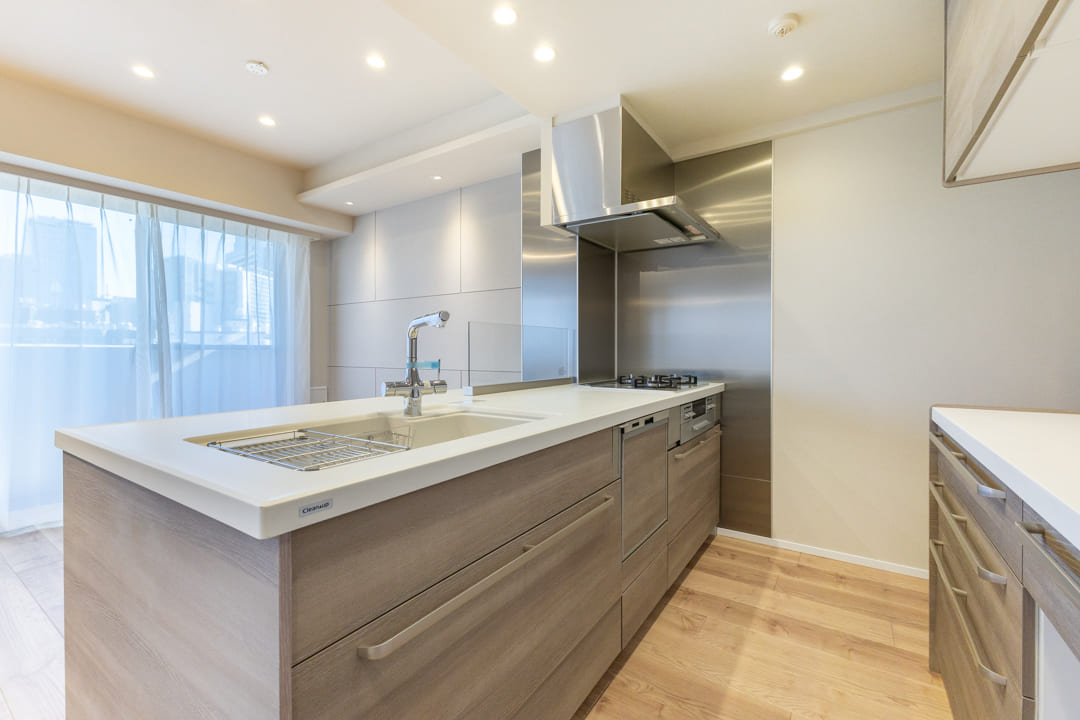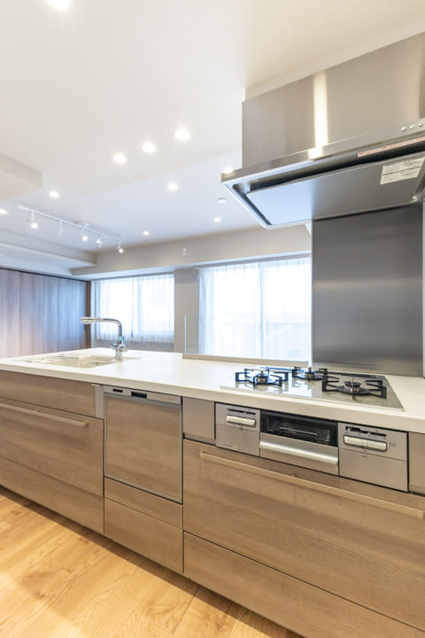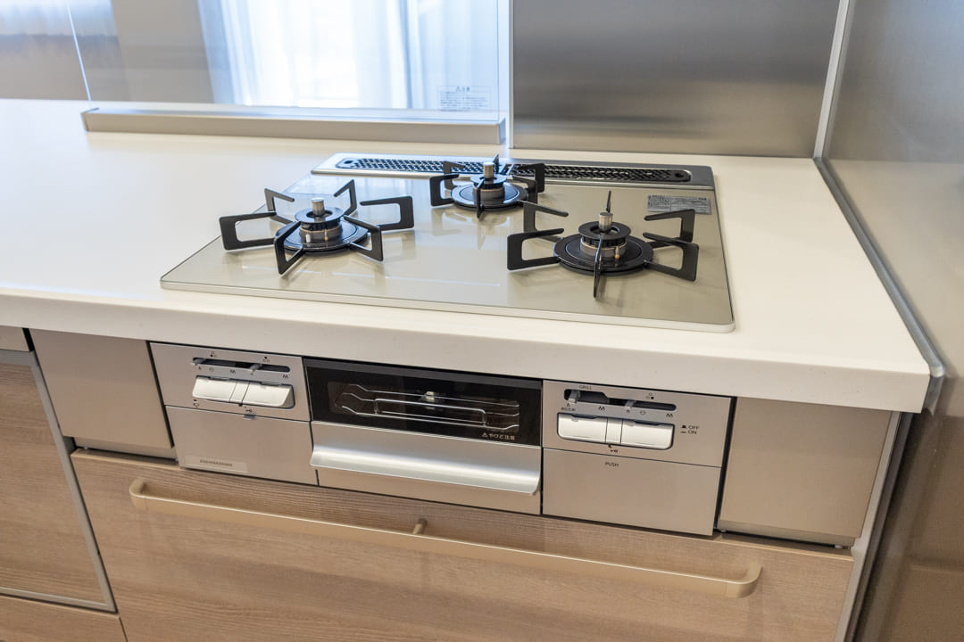 調理の際に手軽においしい水を使用できる浄水器一体型水栓や、同時調理の叶うグリル付3口ガスコンロを完備。食洗機も内蔵されていて、後片付けが捗ります。充実設備で快適なキッチン時間になりそうですね。