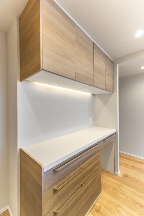 背面にはキッチンと同じデザインのカップボードを完備。食料品のストックや食器類をすっきり収納し、いつも清潔なキッチン空間をキープできます。カウンターにはコンセントを備え、作業スペースとしても活躍しそう。カウンター下のスペースは、ダストボックスを置くのにちょうど良さそうです。