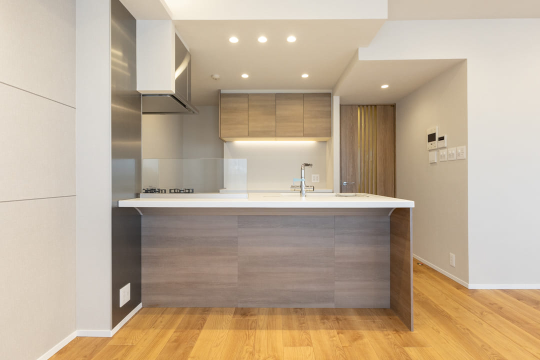 W2440の大型フルフラットキッチン。美しい木目デザインが、家具のように空間へ溶け込み、LDK全体に統一感をもたらします。リビングダイニングを見渡しながら、開放的な気分で調理ができ、家族やゲストとの会話も自然と弾む設計。コンロ前には油跳ねガードを備え、機能性と安心感にも配慮されています。