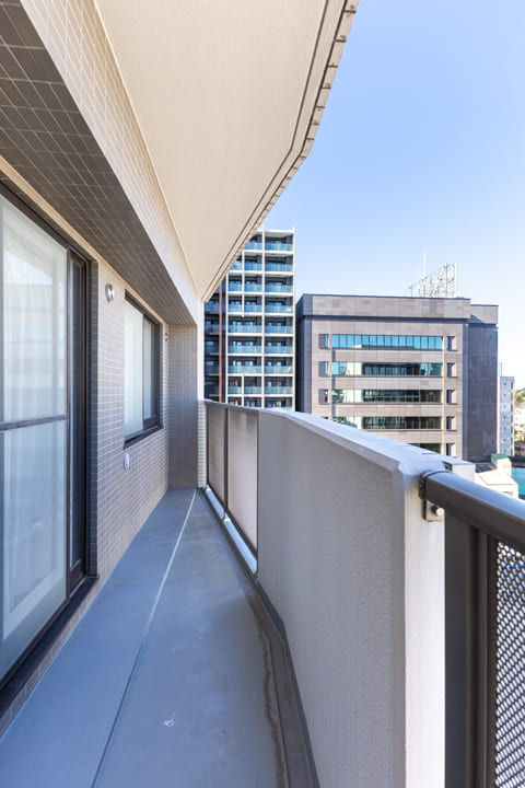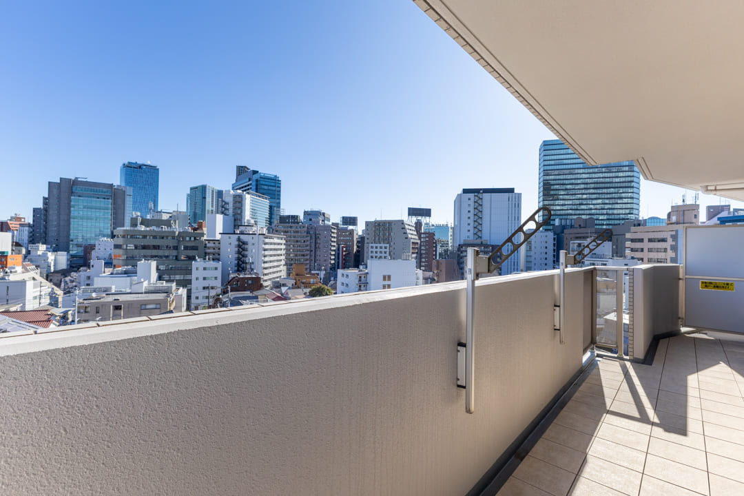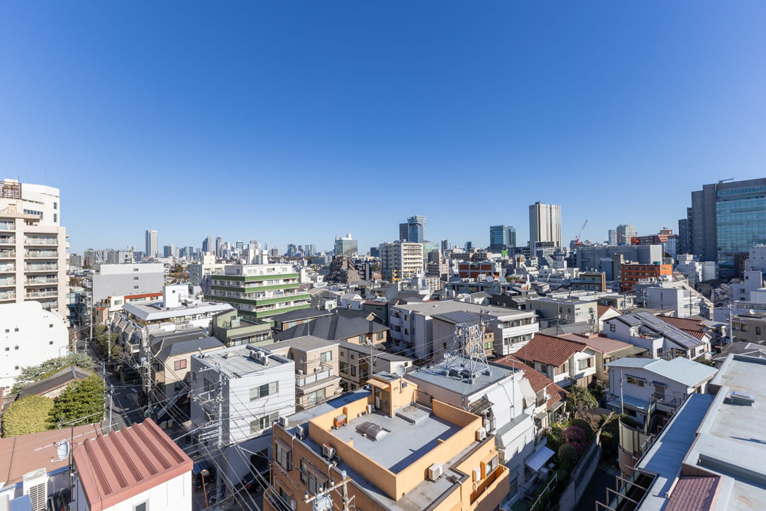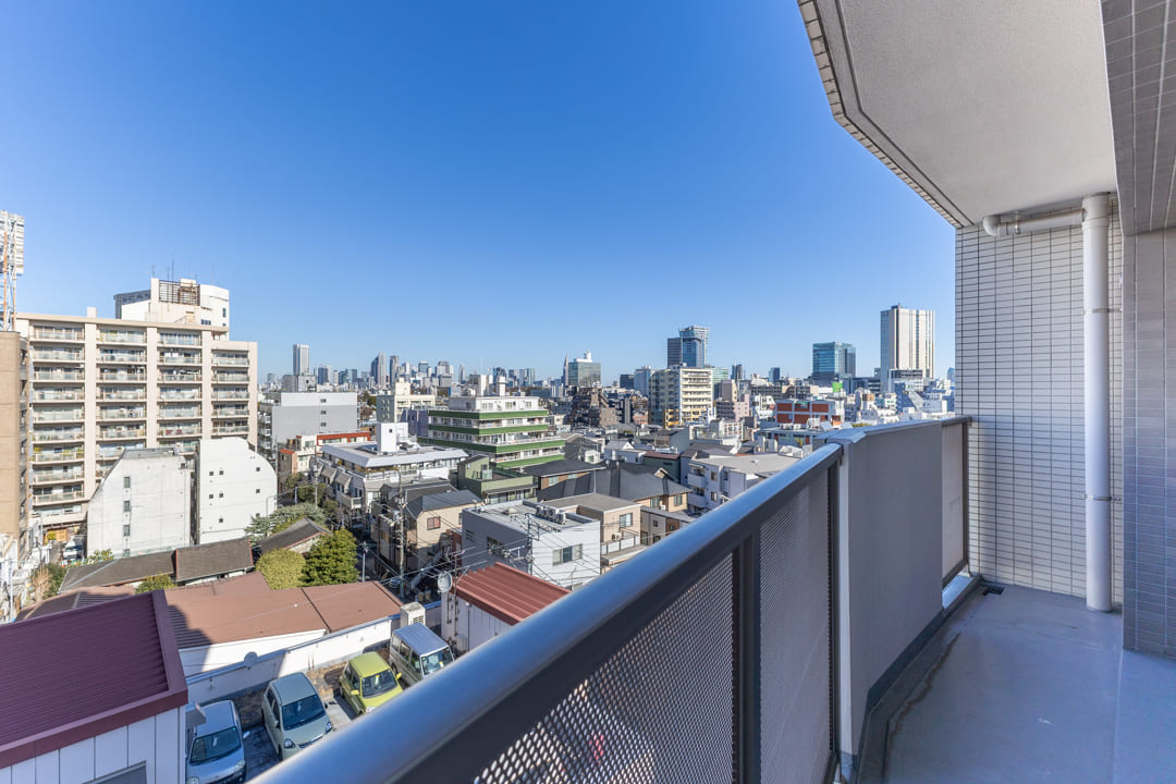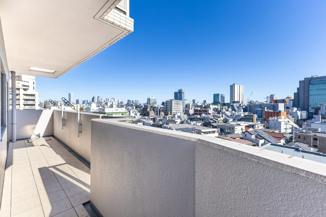LDKと寝室3に跨る、ゆとりあるバルコニー。8階部分ならではの開放的な眺望が広がり、渋谷・新宿の高層ビル群を望む都会的な景色を楽しめます。東向きのため朝日が心地よく差し込み、爽やかな目覚めのひとときや、朝のリフレッシュタイムにもおすすめです。北側にもバルコニーを備え、合計17.97㎡のゆとりある屋外空間を確保しています。