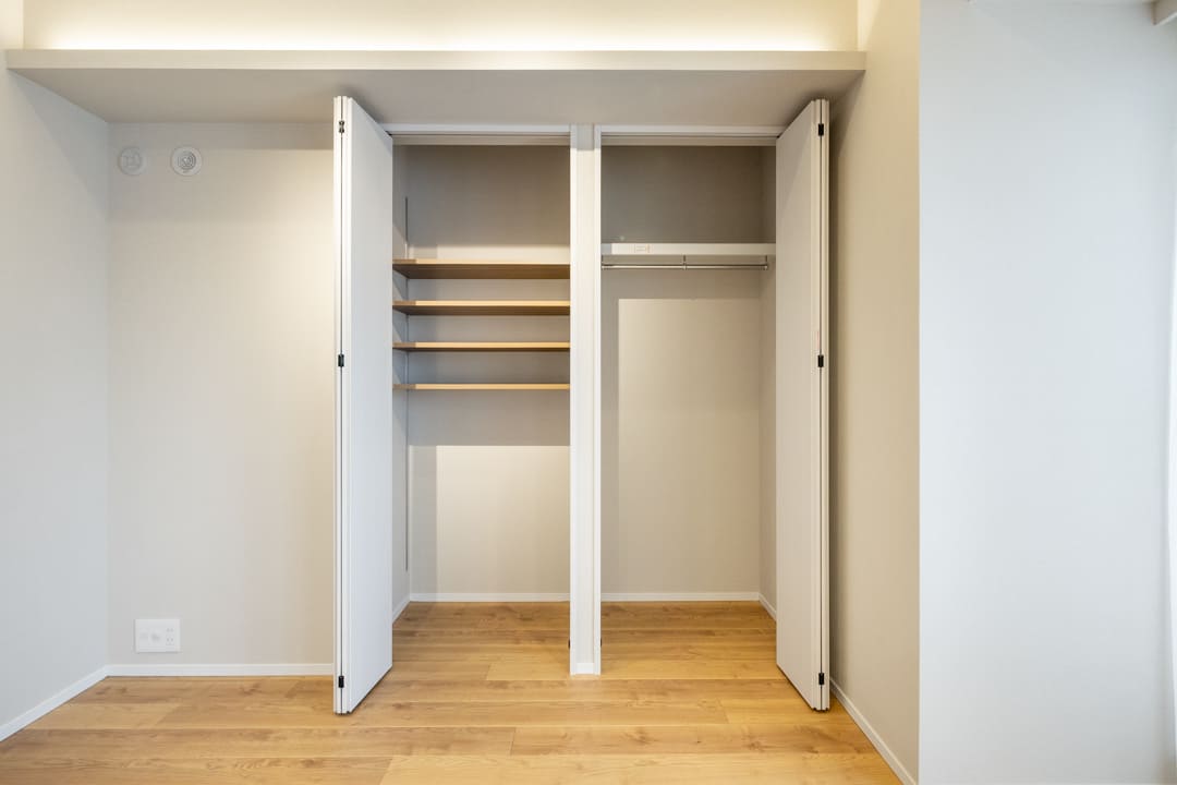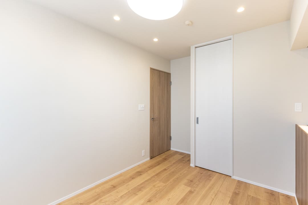 約5.3帖の寝室3。LDKに隣接し、引き戸で仕切られたフレキシブルな空間です。扉を閉めれば独立性の高い個室として、ワークスペースや趣味のお部屋にも活用可能。扉を開放すれば、LDKと一体感のある広々とした空間としてお使いいただけます。クローゼットにはハンガーパイプと可動棚を備え、衣類や小物をすっきりと整理しやすいのも嬉しいポイントです。