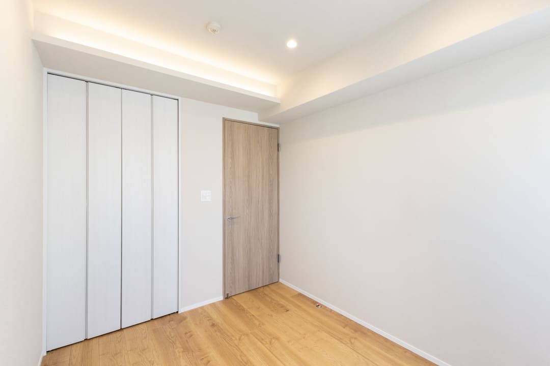 廊下の突き当たりに位置する、約4.5帖の寝室2。バルコニーに面しており、やわらかな自然光が差し込む、明るく心地よい空間です。4枚折れ戸のクローゼットを備え、収納スペースもしっかりと確保。コンパクトながら機能的で、子ども部屋やプライベートルームとしても使いやすい一室です。