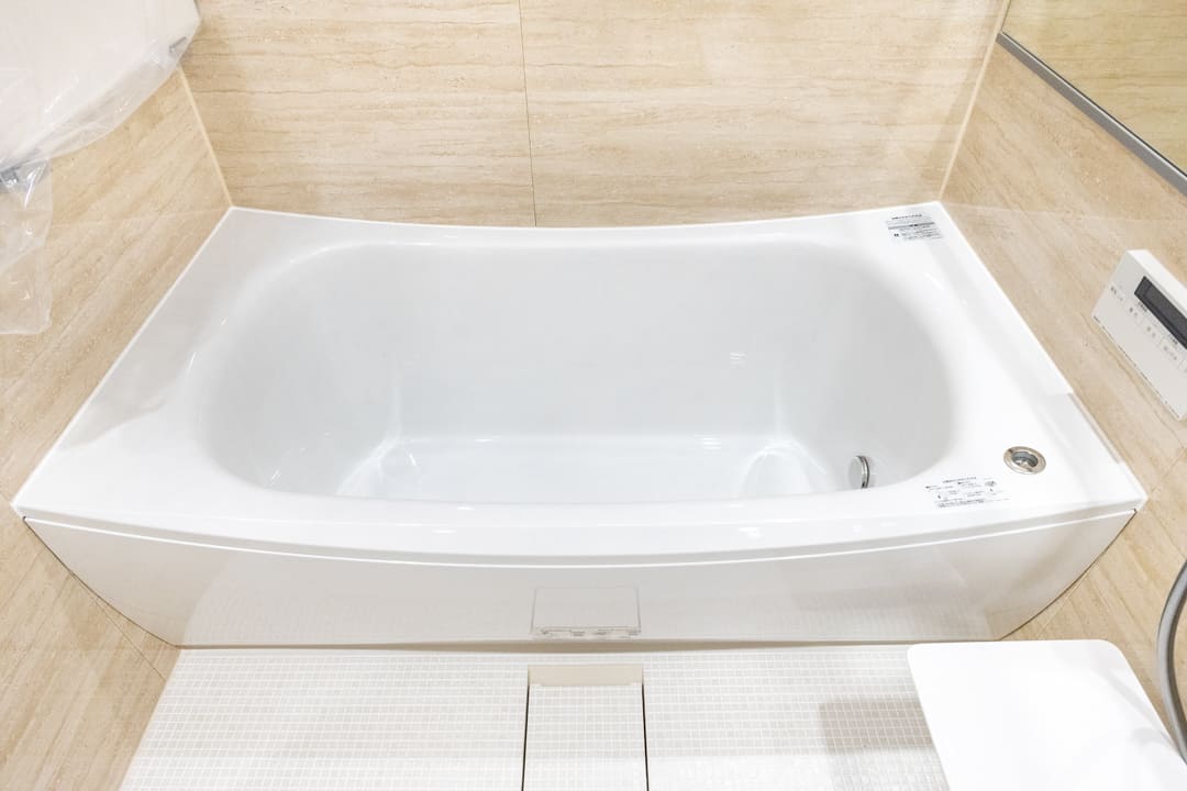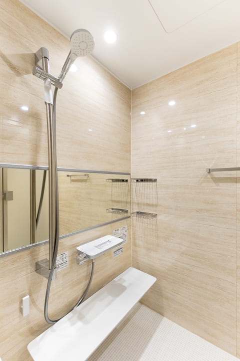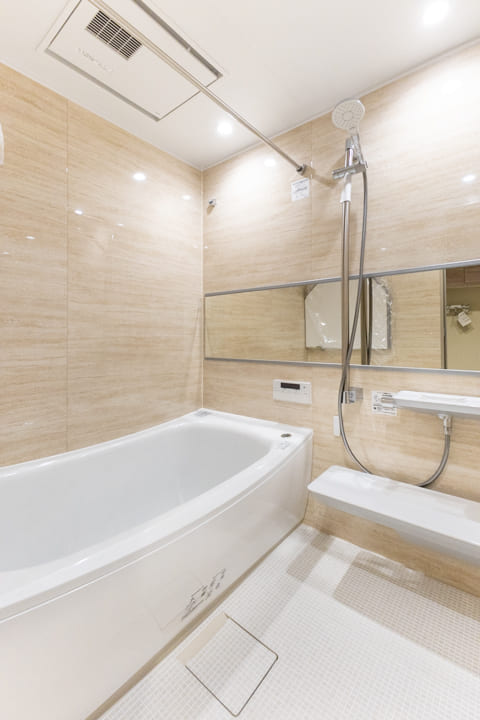 1418サイズのバスルーム。ワイドミラーが奥行きを演出し、開放的な印象をもたらします。浴室換気乾燥暖房機や追い焚き機能を備え、設備面も充実。保温浴槽を採用しているため、お湯のあたたかさが長持ちし、快適なバスタイムをお楽しみいただけます。
