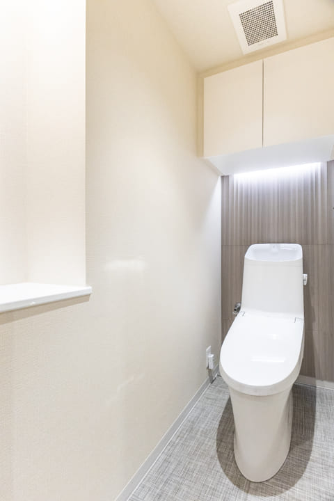 廊下に面していて独立性の高いレストルーム。さりげないアクセントウォールと間接照明が、洗練された空間を演出します。LIXIL製の洗浄機能付トイレに交換済み。吊戸棚とカウンターを備え、隠す収納と見せる収納の使い分けが可能です。