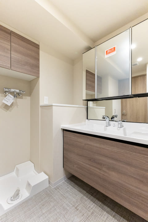 脱衣スペースを兼ねた洗面室。木目扉が美しい洗面化粧台が設置されています。三面鏡&ミドルミラー付きで使い勝手良好◎。小さなお子様も台に乗らずに鏡を見ることができ、一人でも身支度しやすい仕様です。ミラーボックスや足元の引き出しに加え、リネン庫も備わっていて、収納性の高さも魅力です。