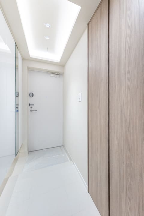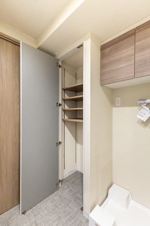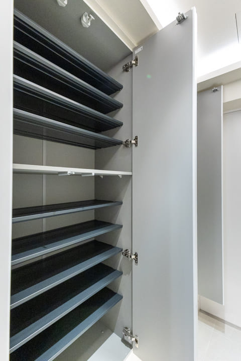折り上げ天井に施された間接照明が、ホテルライクな空間を演出する玄関ホール。清潔感のあるタイルフロアも魅力です。大容量のシューズボックスを備え、散らかりがちな靴をすっきり収納可能◎。廊下にも可動棚収納があり、日用品ストックやペットグッズの収納に便利です。